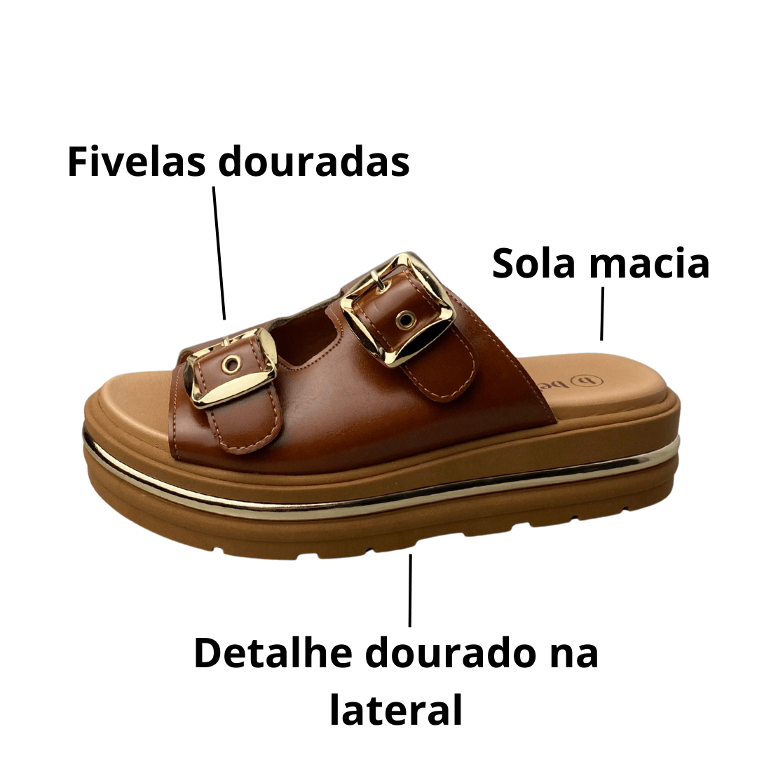 Duas fivelas ajustáveis em dourado, que garantem estilo e ajuste perfeito;