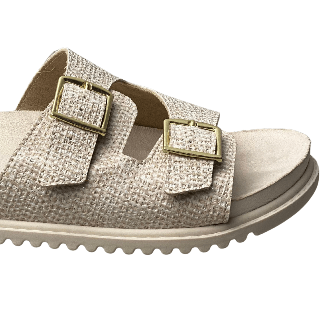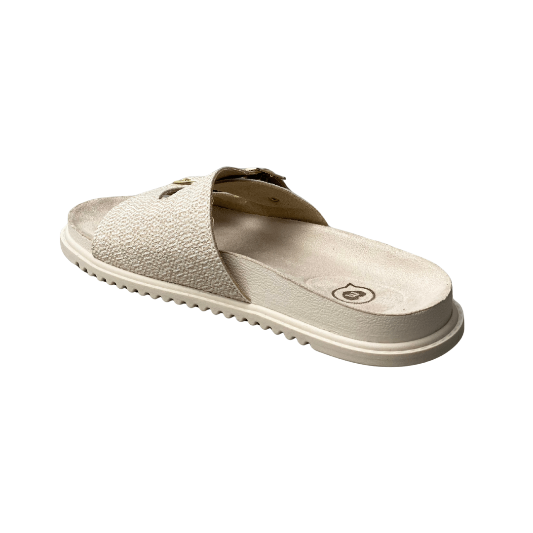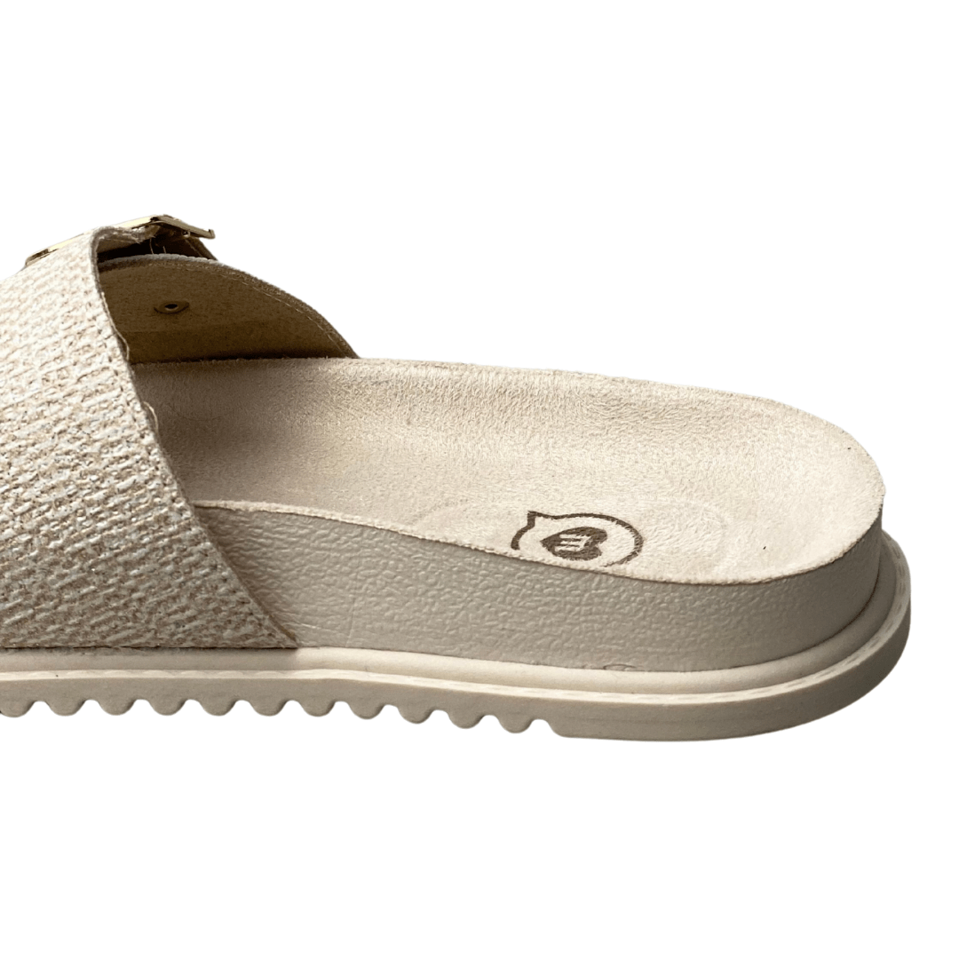 Estilo Casual Chic: A cor Creme texturizada e as fivelas douradas conferem um visual moderno e elegante à rasteira, tornando-a ideal para passeios e momentos de lazer.