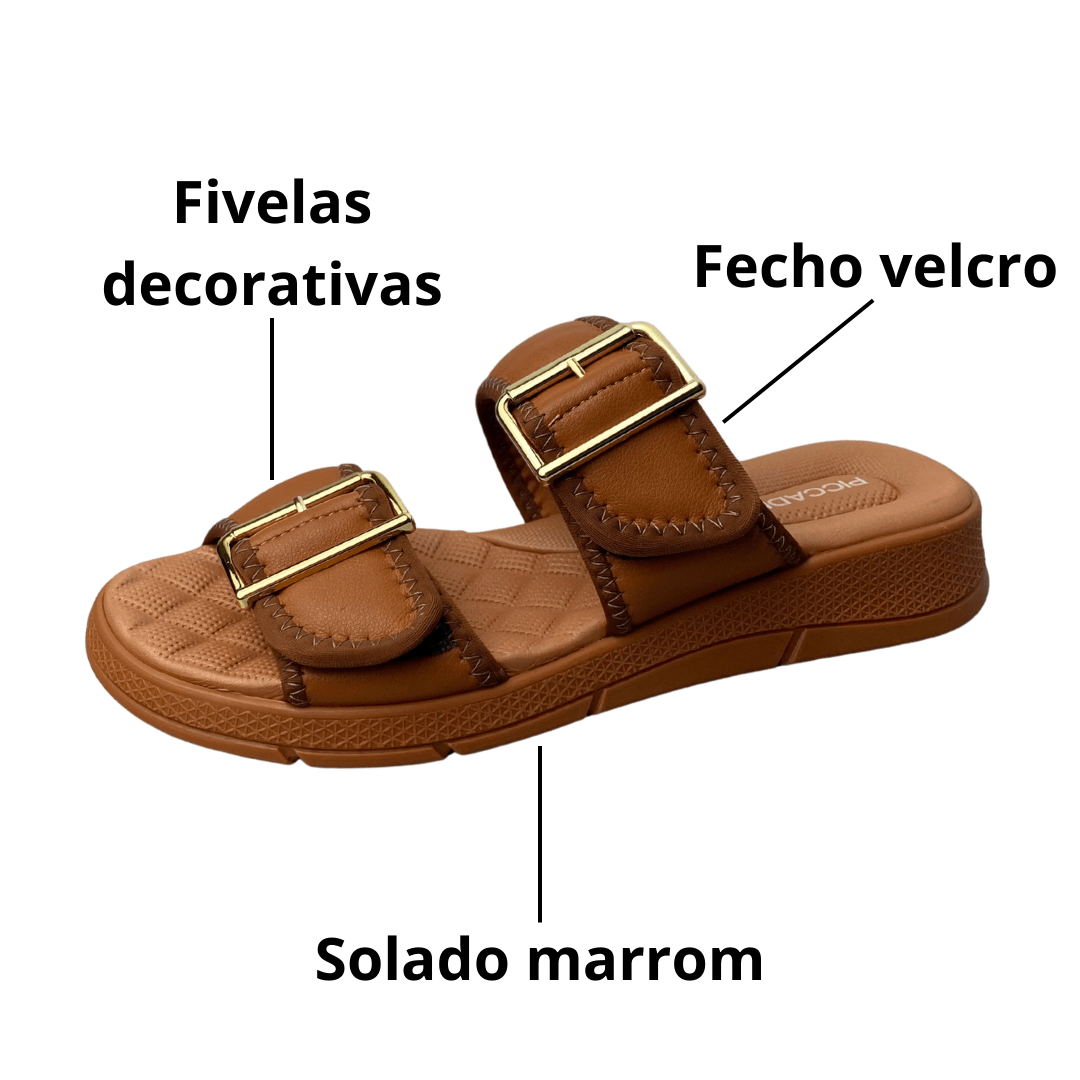 Estilo refinado: O tom pinhão (marrom elegante) combinado com as fivelas douradas traz um visual sofisticado, moderno e cheio de personalidade.