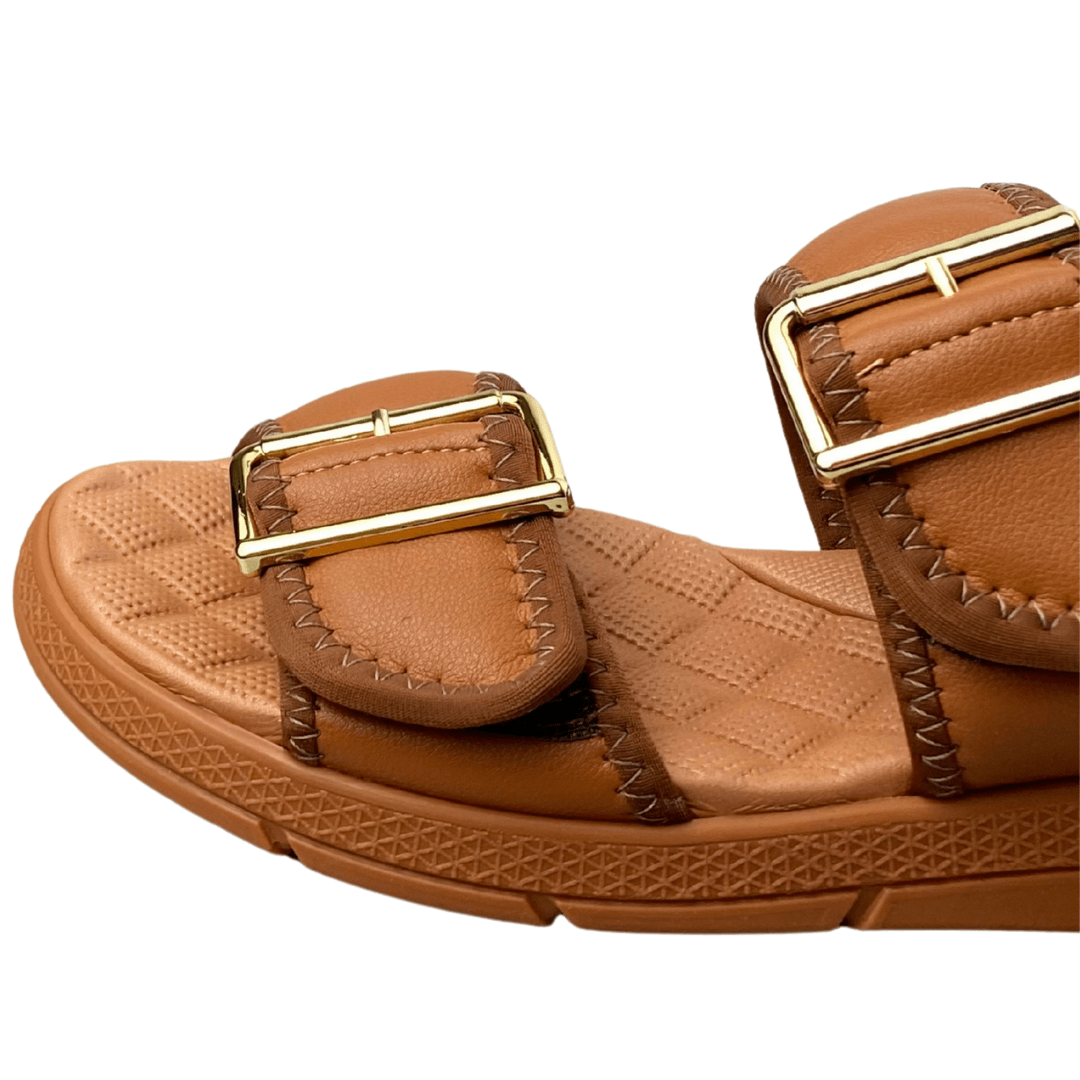 Fivelas douradas: Duas fivelas com acabamento metálico que garantem charme e um ajuste firme aos pés.
