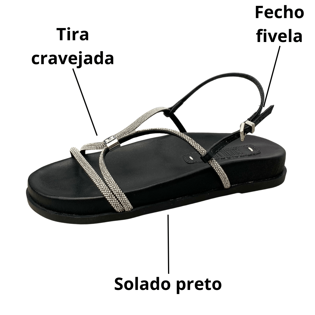 Detalhes: tiras cravejadas que dão brilho e elegância.