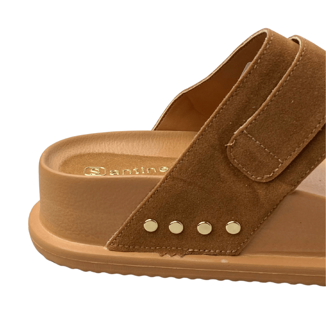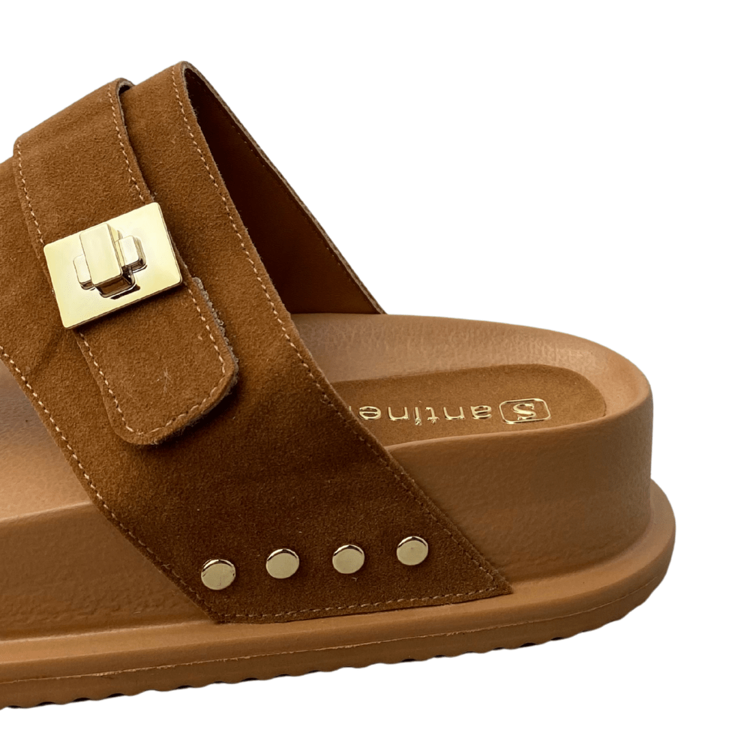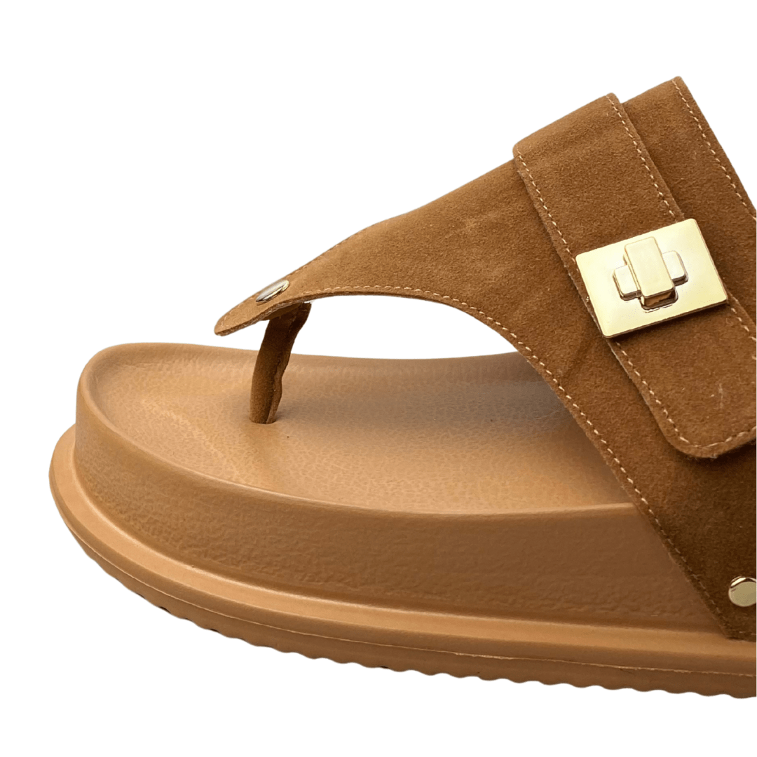 Detalhes com fivela lateral e tachas douradas, agregando sofisticação.