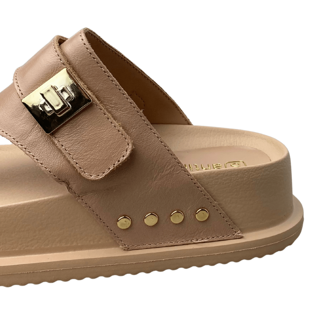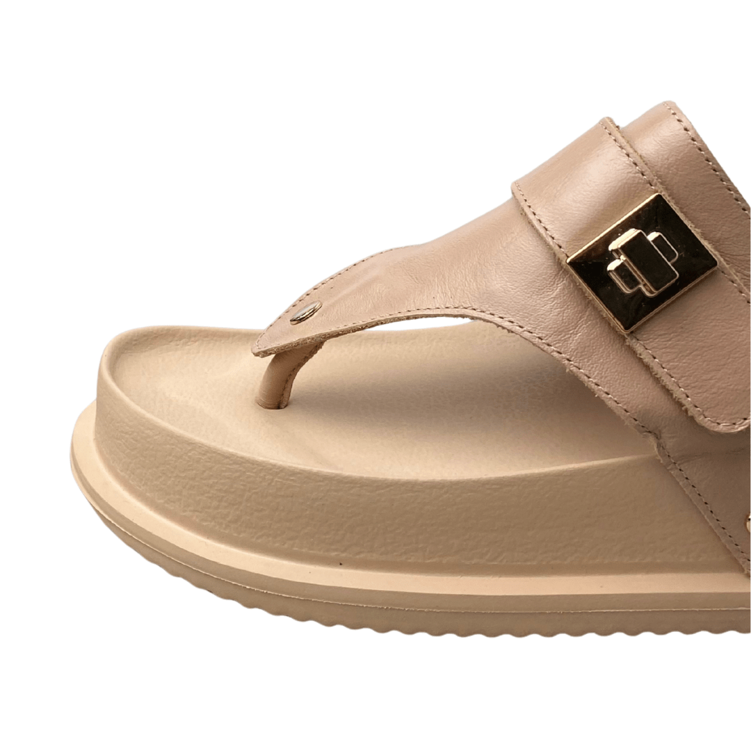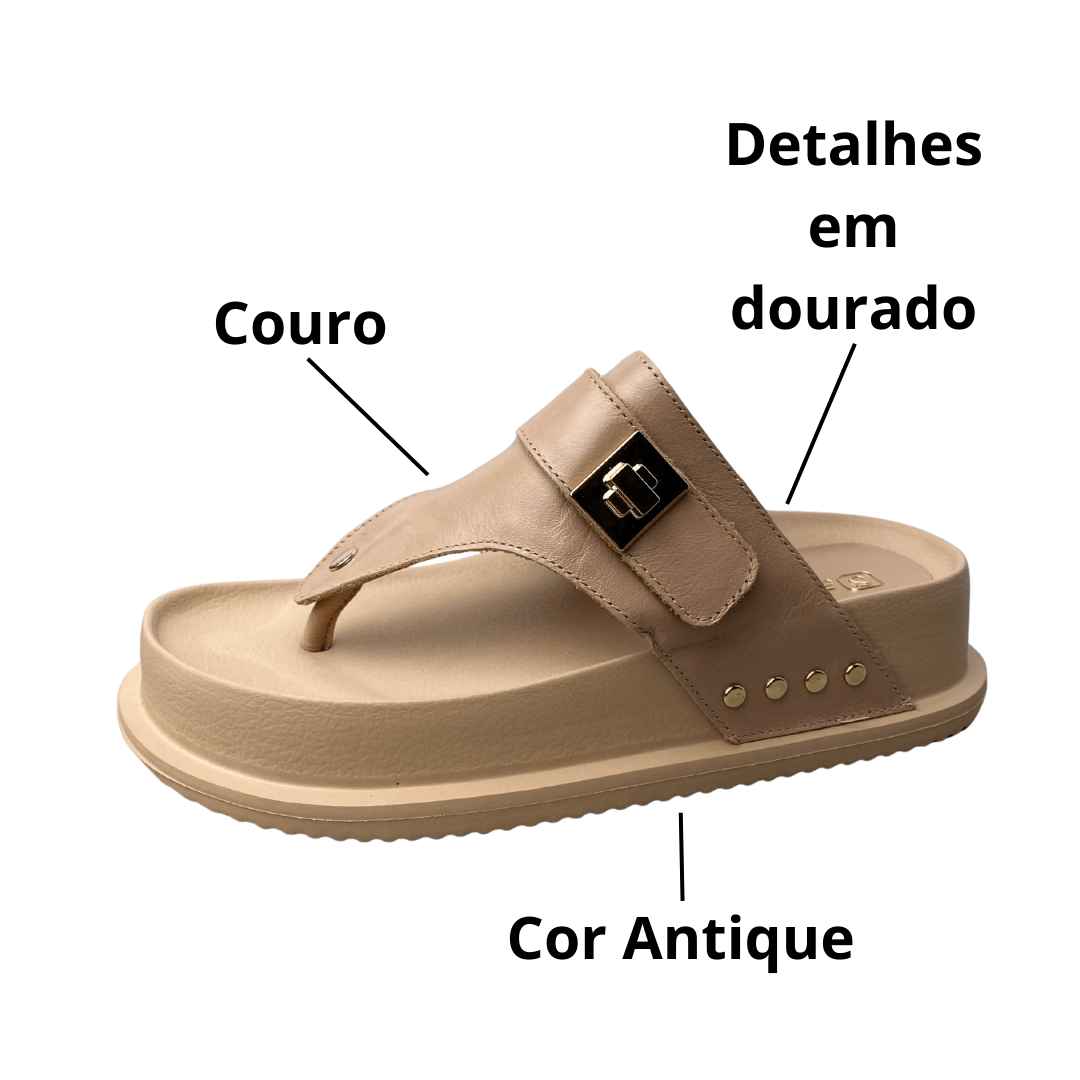 Detalhe de fivela lateral dourada que traz charme e elegância.