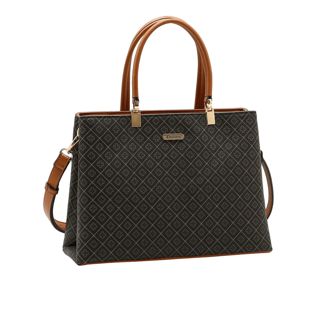 A Bolsa Chenson Café é sinônimo de sofisticação e organização. Com um formato imponente e amplo espaço interno, esta peça apresenta um monograma clássico em tons terrosos, destacando-se como um acessório de presença que complementa tanto looks executivos quanto produções mais casuais e elegantes.