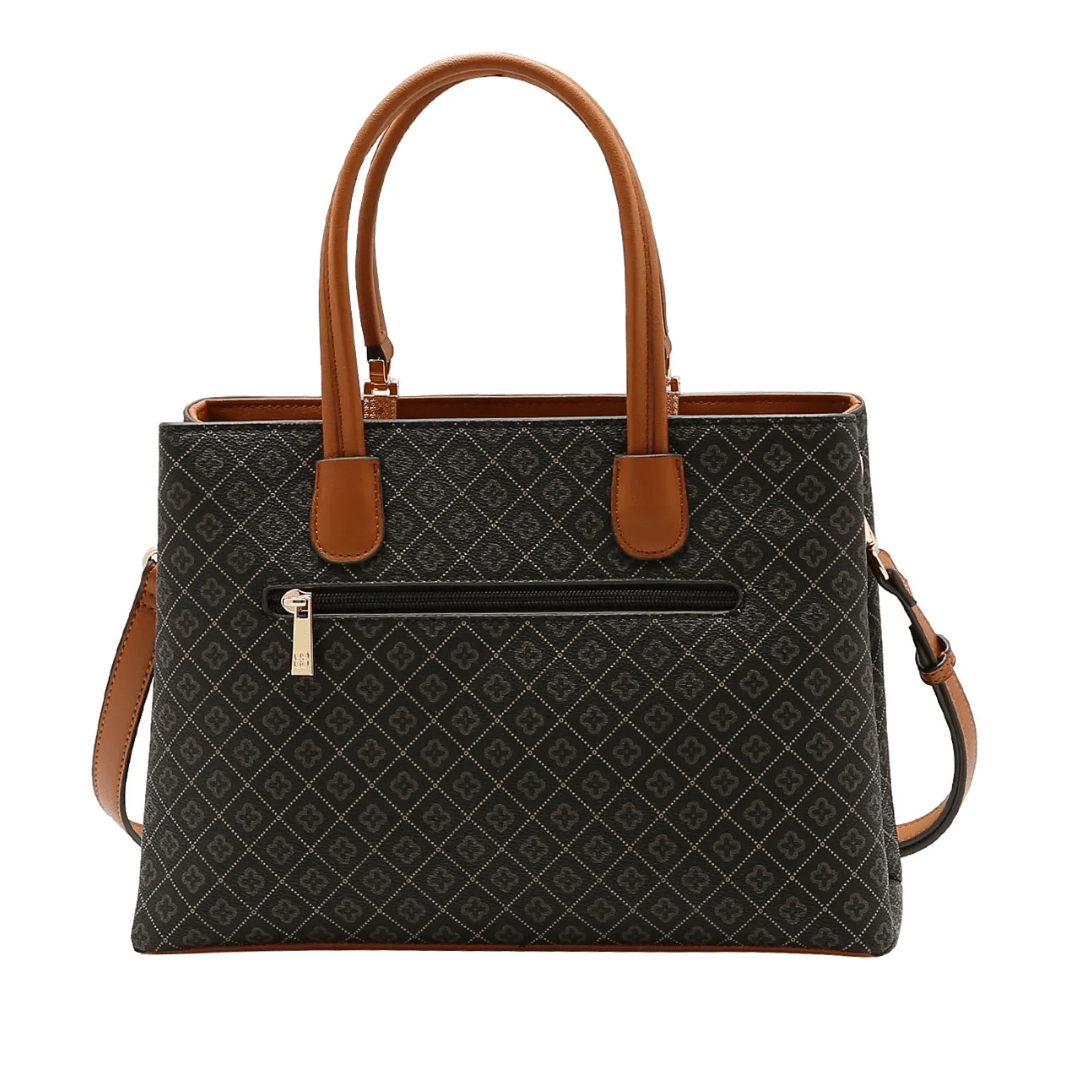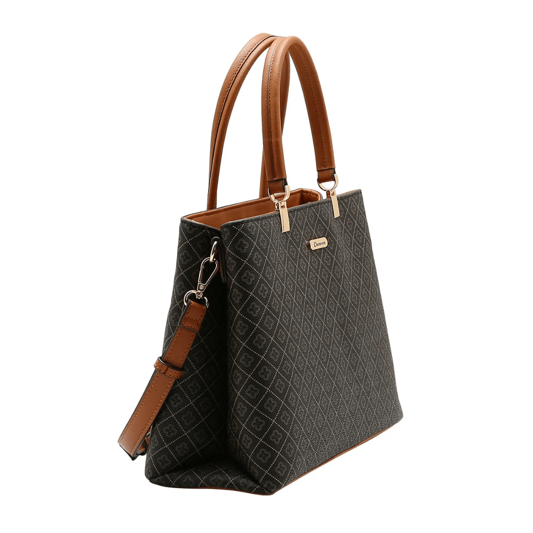Design Atemporal: O contraste entre o marrom café e os detalhes em caramelo nas alças cria uma estética de luxo que permanece atual em todas as estações.
