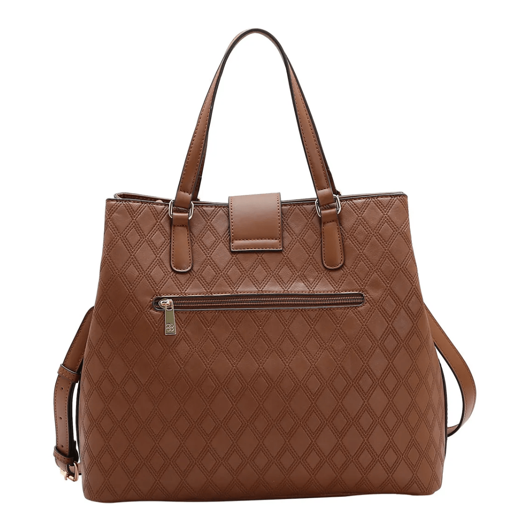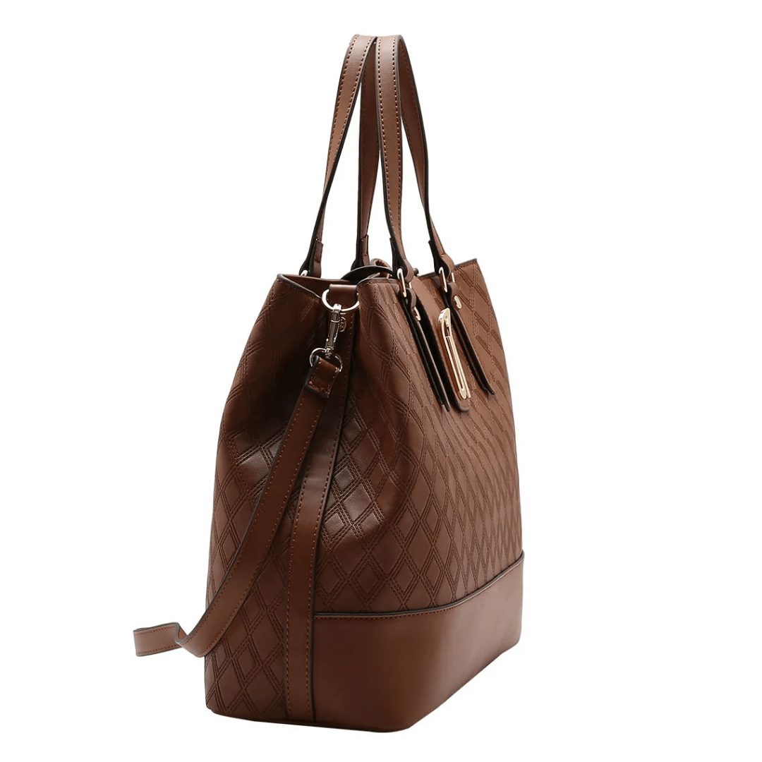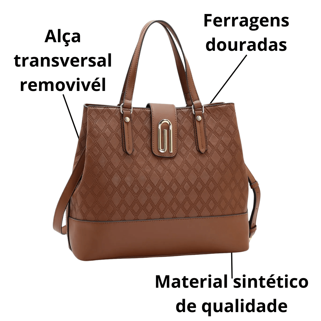 A Bolsa Chenson Tote Café destaca-se pela sua textura rica e imponente. O corpo da bolsa apresenta um trabalho em relevo que forma diamantes, criando uma profundidade visual que foge do comum. Complementada por detalhes em tom caramelo e um fecho dourado exclusivo, esta peça é perfeita para quem não abre mão da elegância em dias longos e produtivos.