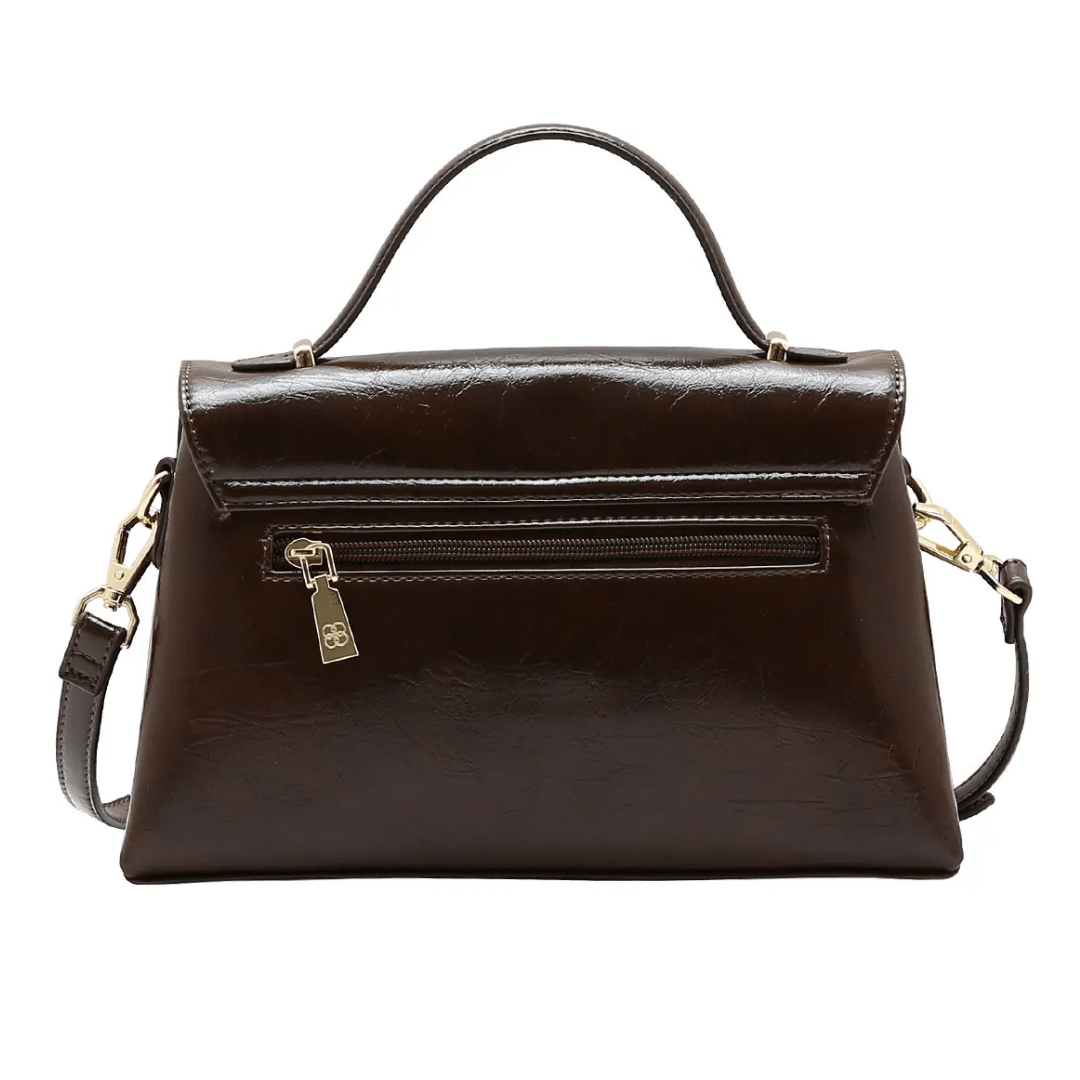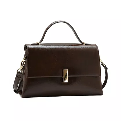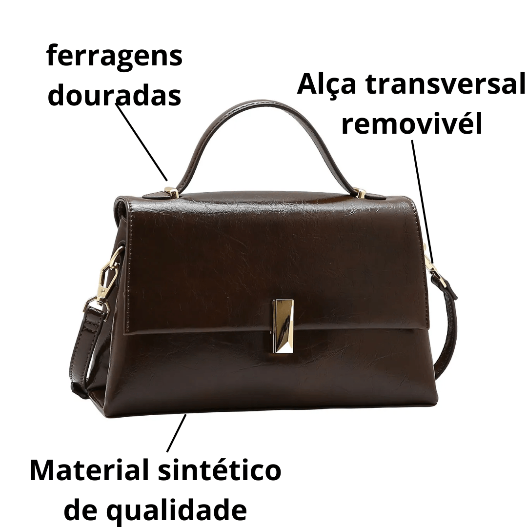 Design: Satchel estruturada com lapela frontal e fecho retangular em metal.