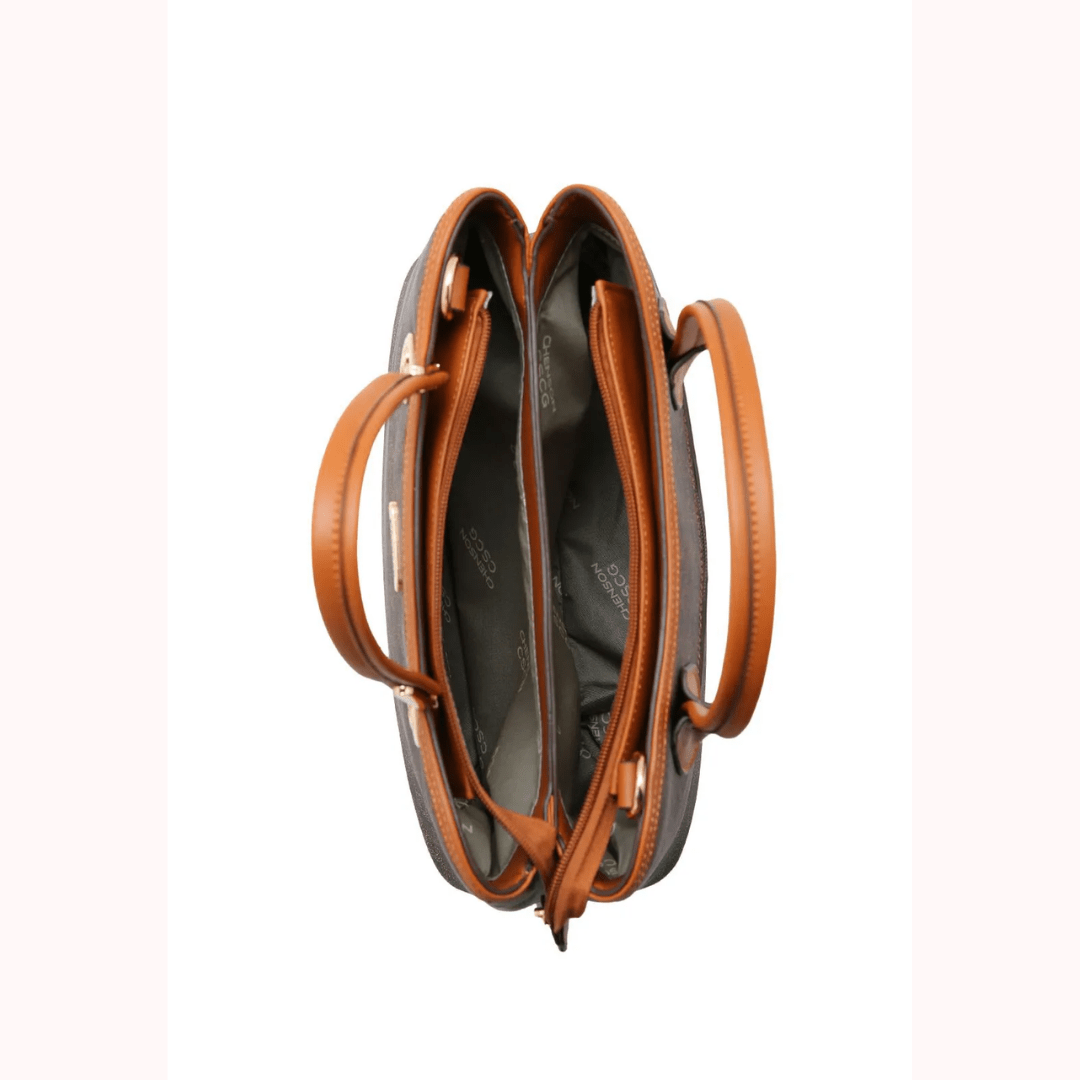 Cor: Café, com estampa monograma discreta e acabamento refinado.