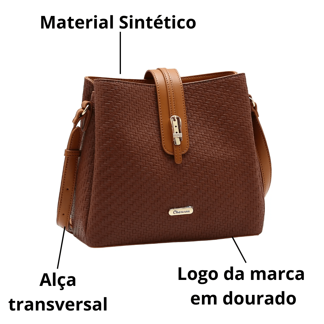 Toque de Luxo: Ferragens em dourado, incluindo o logo Chenson e a fivela frontal, adicionam sofisticação ao modelo.