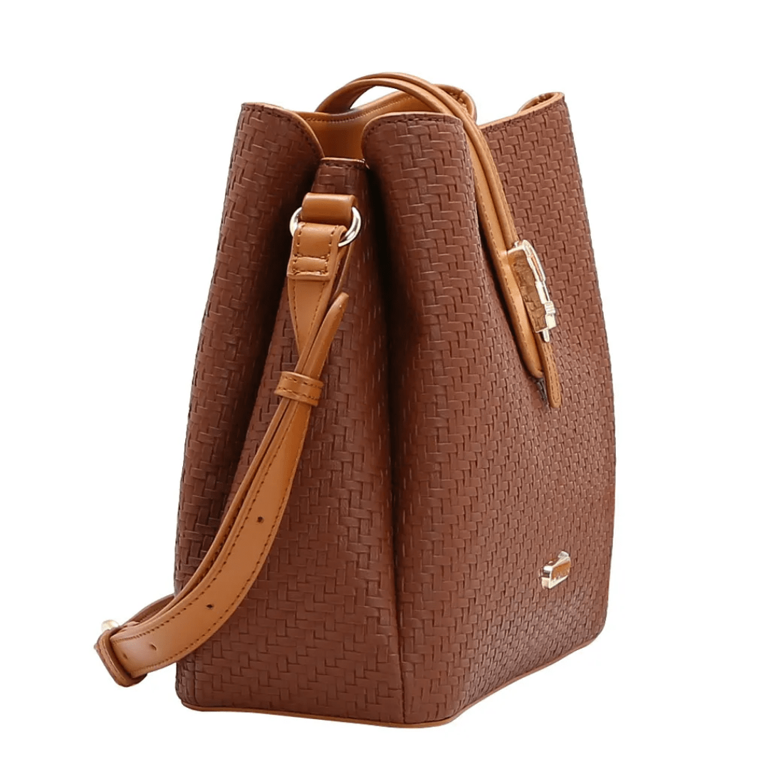 Desperte suspiros com a Bolsa Chenson Marrom. O design bucket (formato de saquinho estruturado) ganha uma textura tressê sofisticada, que contrasta perfeitamente com os detalhes em material liso e metais dourados. É a peça-chave para quem busca um acessório com personalidade, sem abrir mão da funcionalidade para o dia a dia.