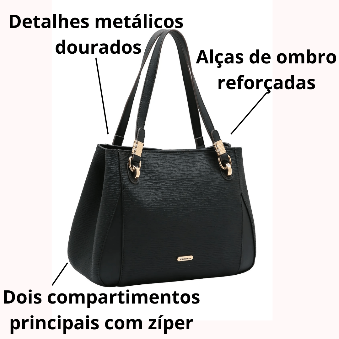 A Bolsa Chenson é a escolha perfeita para quem deseja unir sofisticação, versatilidade e praticidade em um só acessório. Seu design elegante com ferragens douradas traz modernidade e charme, enquanto seu espaço interno garante organização e segurança no dia a dia.