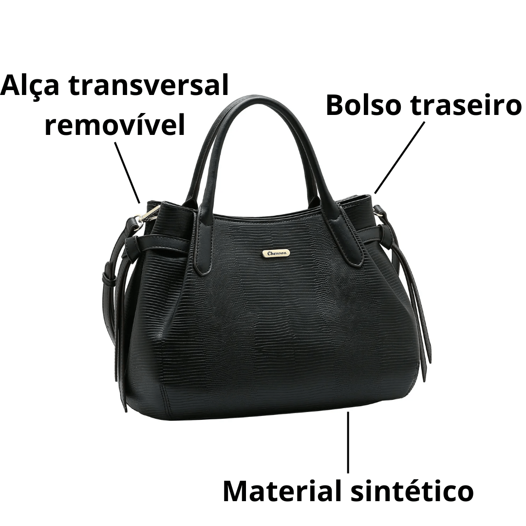 Sofisticação nos Detalhes: A textura de cobra e o logo dourado da Chenson adicionam um toque de luxo imediato.
