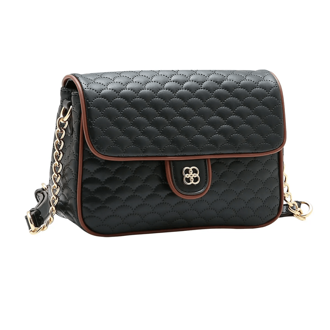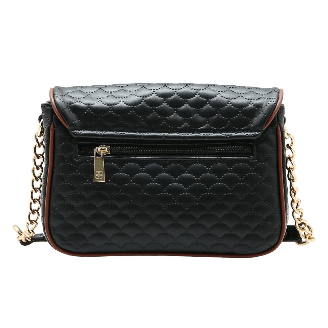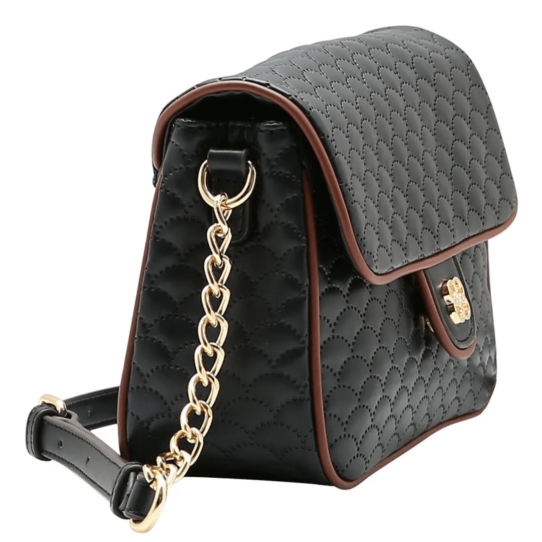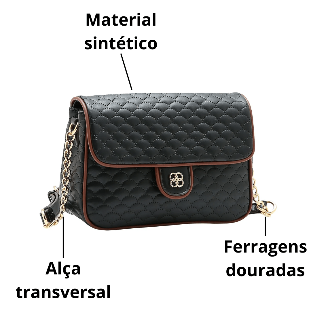 A Bolsa Chenson Feminina Preta redefine o conceito de "pretinho básico". Com um design estruturado e um matelassê exclusivo em formato de escamas/ondas, ela se destaca pelos detalhes: o contorno marrom traz sofisticação, e a alça que mistura corrente e material sintético adiciona o brilho necessário para elevar qualquer produção.