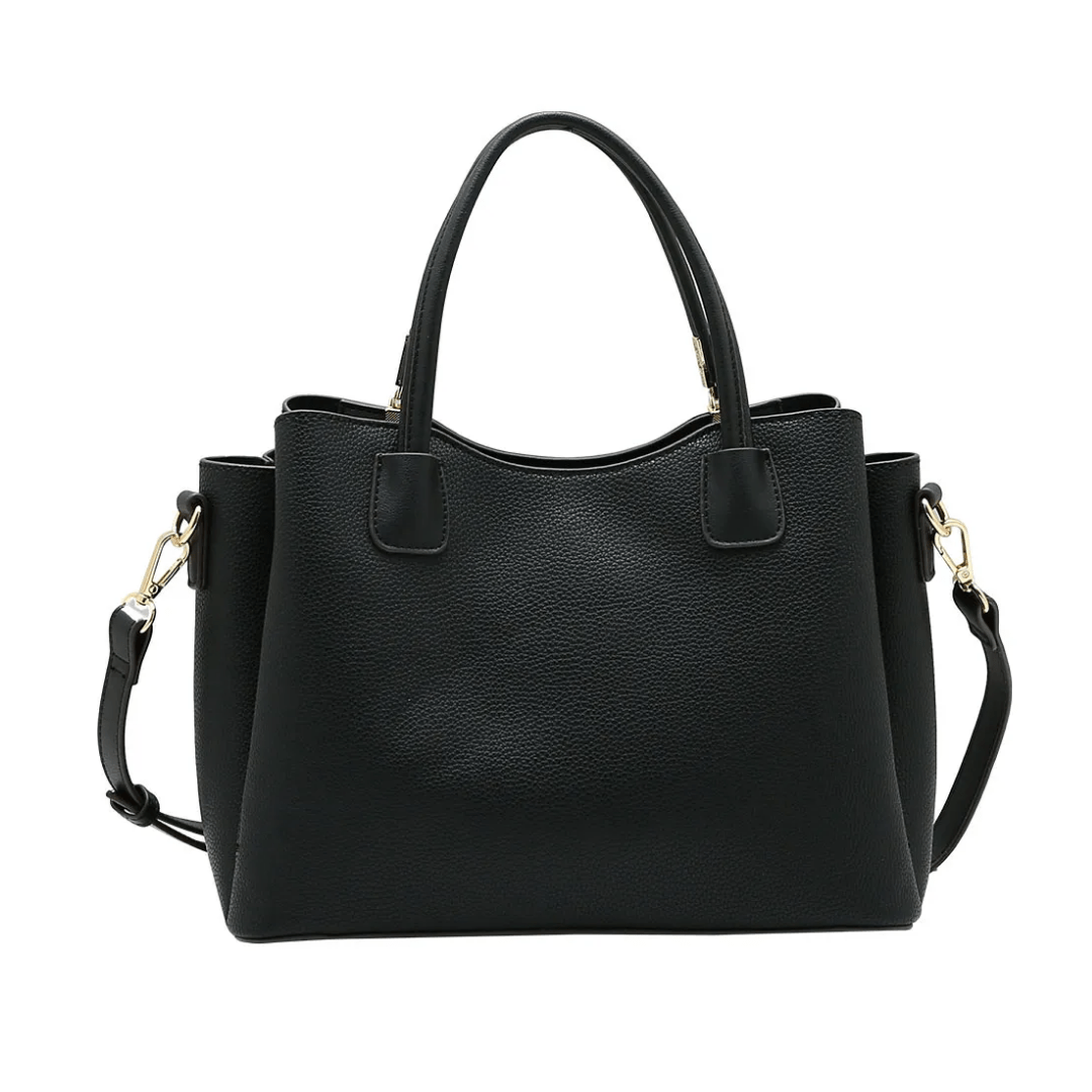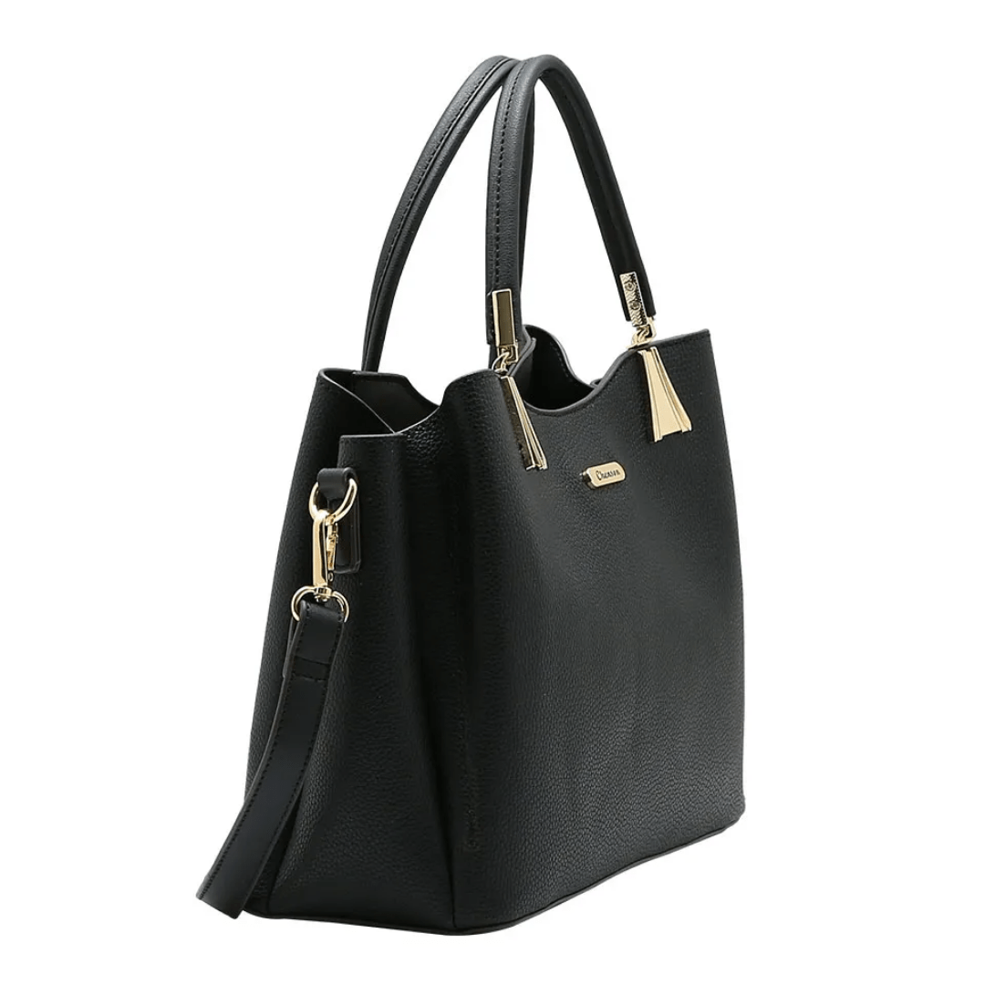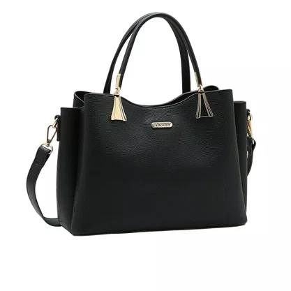 A Bolsa Chenson Satchel Preto destaca-se pelo seu acabamento texturizado premium e pelas ferragens douradas imponentes que funcionam como joias na peça. Sua estrutura robusta e o design curvilíneo na abertura conferem um ar de luxo moderno, tornando-a a escolha perfeita para ambientes profissionais ou eventos sociais que exigem um visual impecável.