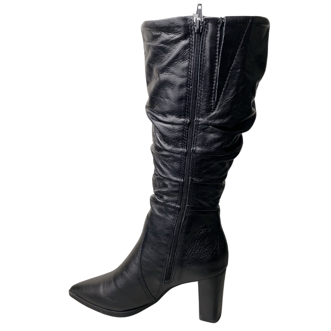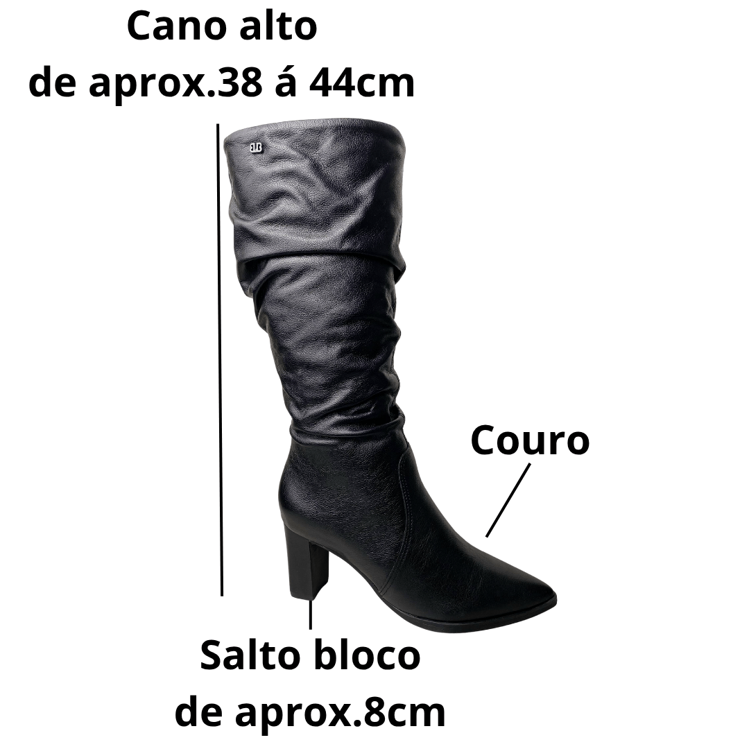 O cano fica "caindo"? Não. O efeito slouchy (franzido) já faz parte do design da bota, mas o couro possui estrutura suficiente para manter a altura e o estilo no lugar.