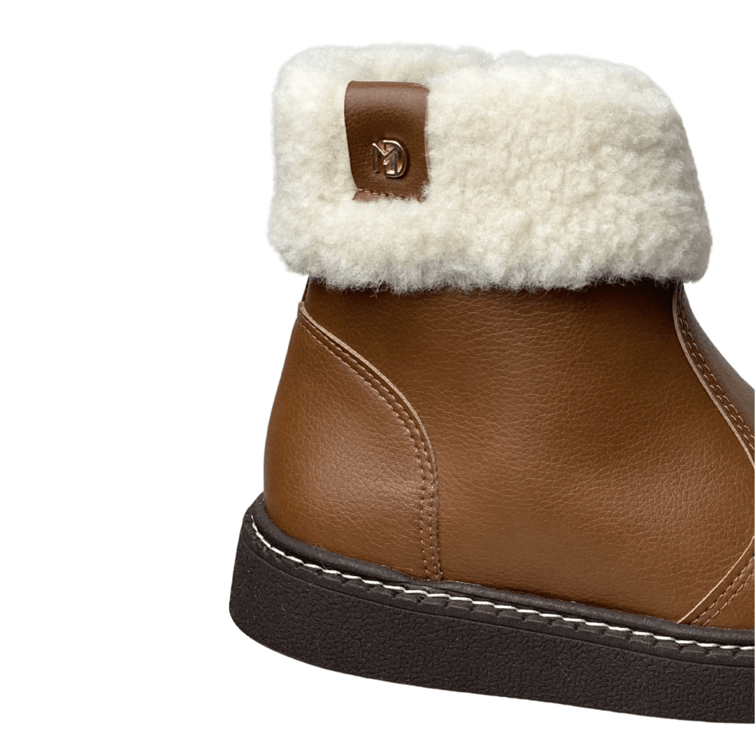 Detalhe de Estilo: Cano curto com acabamento em pelúcia off-white (branca) e pin metálico dourado da marca.