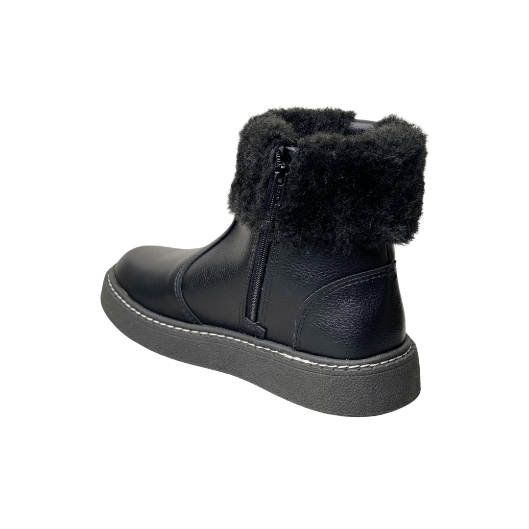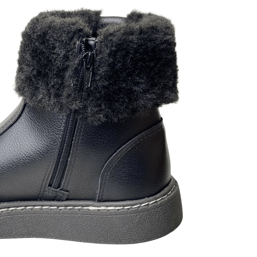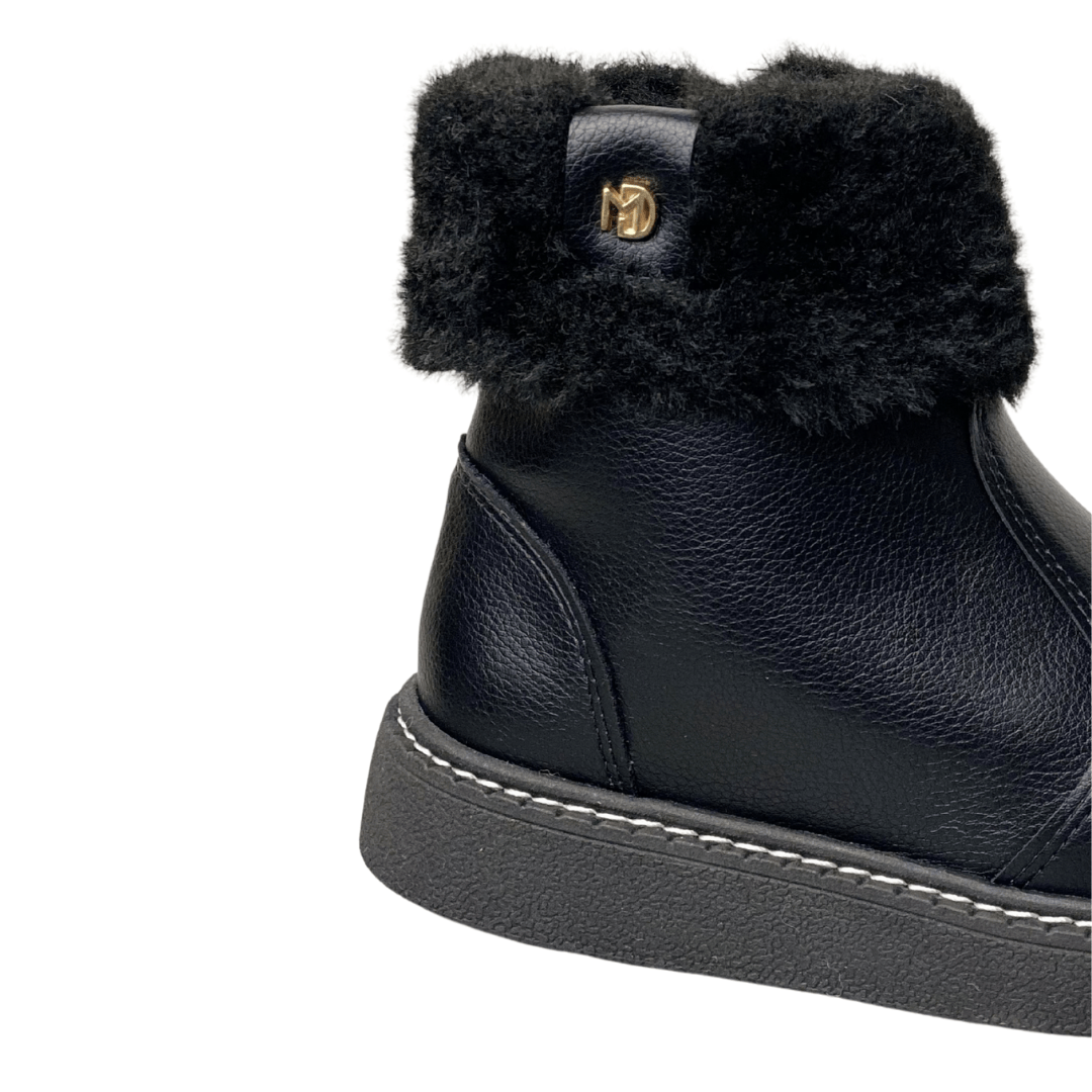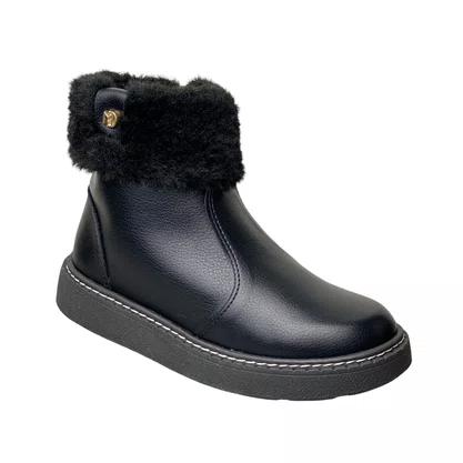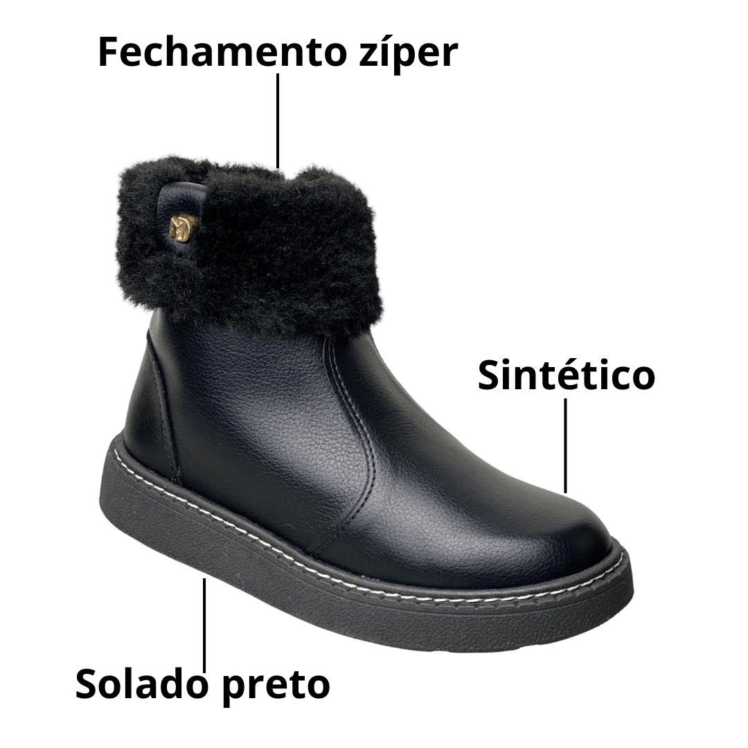 Detalhe Especial: Cano curto com gola de pelos sintéticos macios e detalhe metalizado dourado com o logo da Modare.