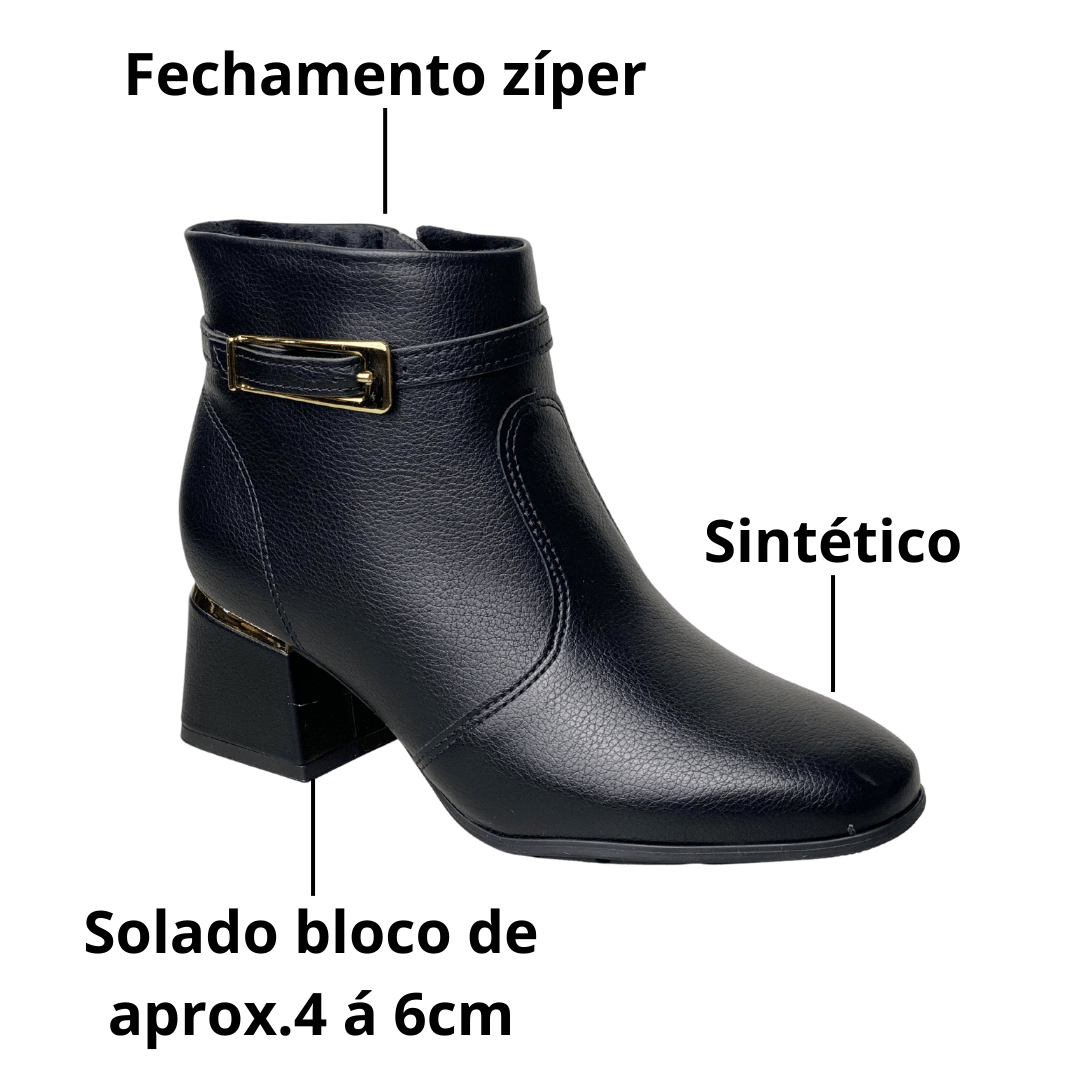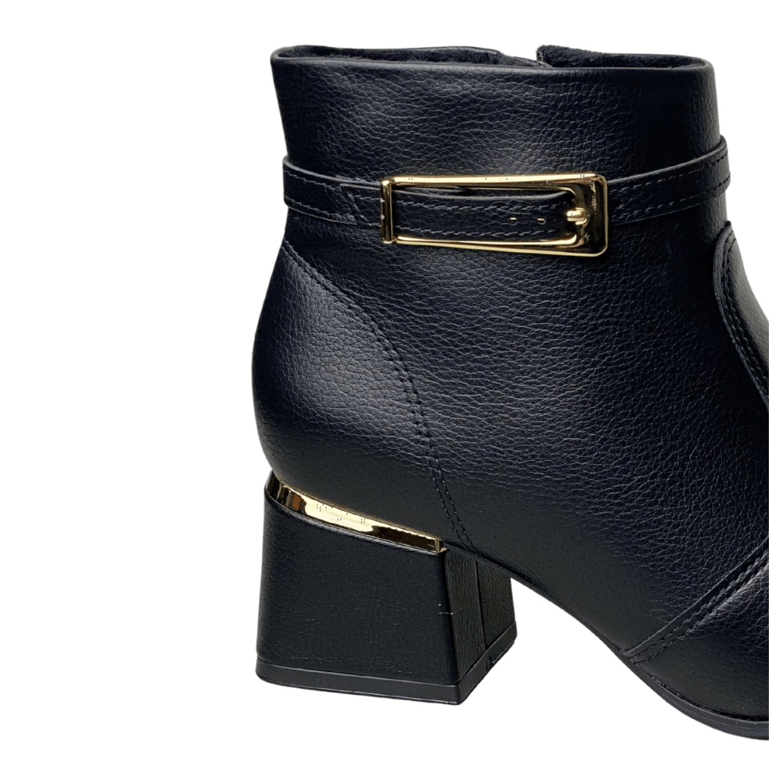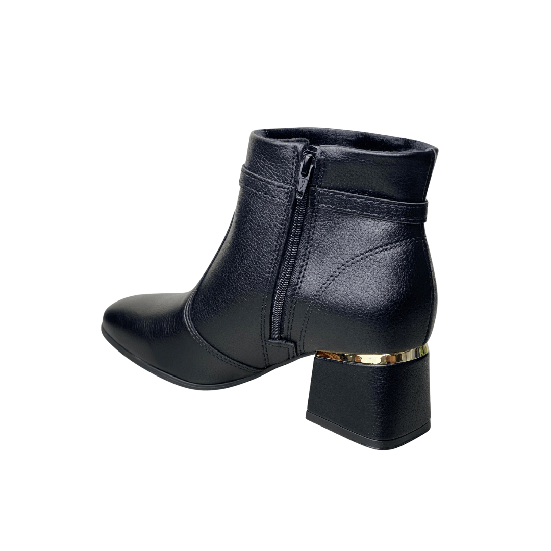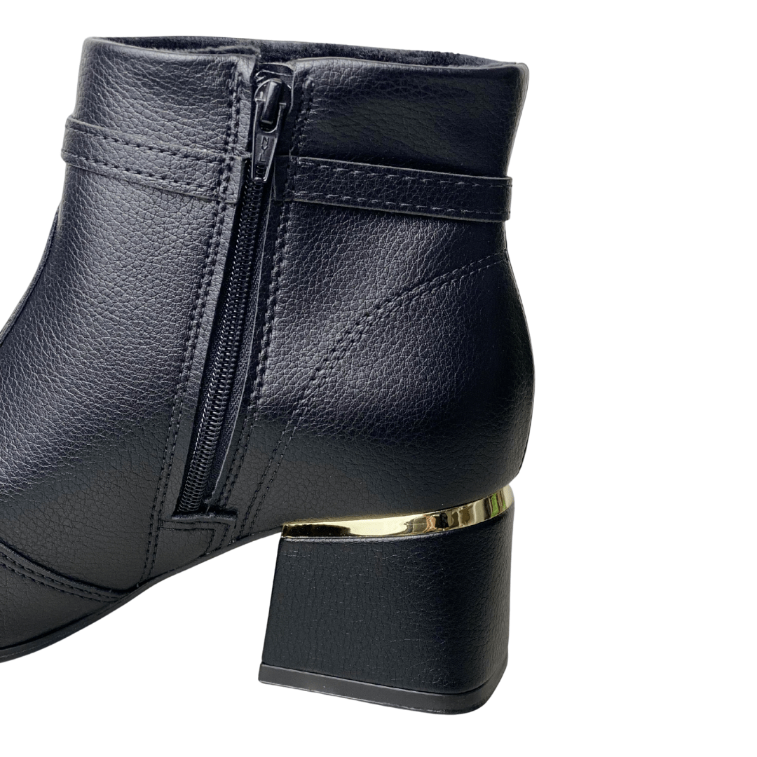 A bota que une o clássico ao moderno. Desenvolvida pela Modare, referência em bem-estar, este modelo em preto fosco traz uma textura sofisticada e detalhes dourados que elevam qualquer visual, sem abrir mão do conforto necessário para o dia a dia.