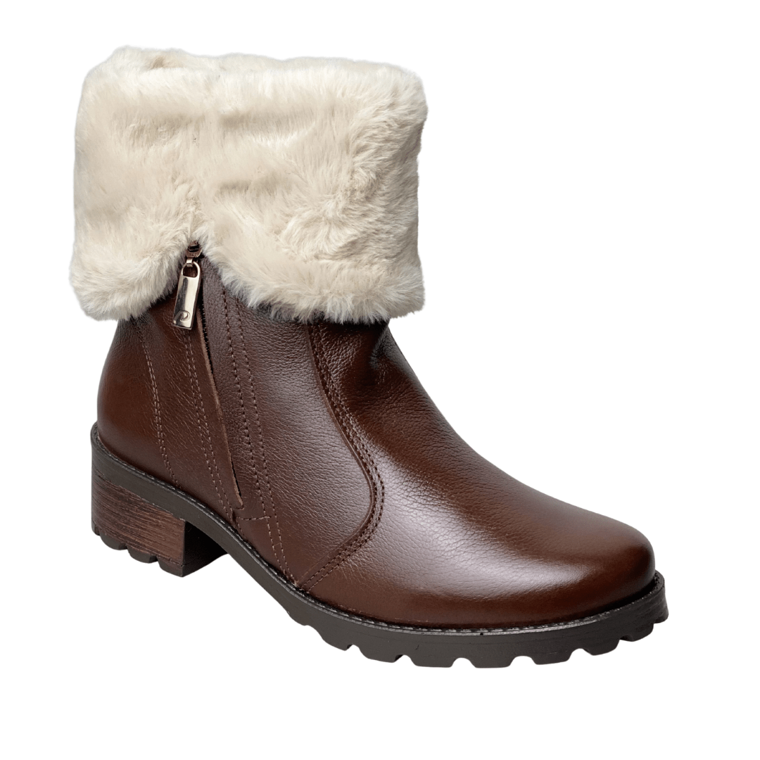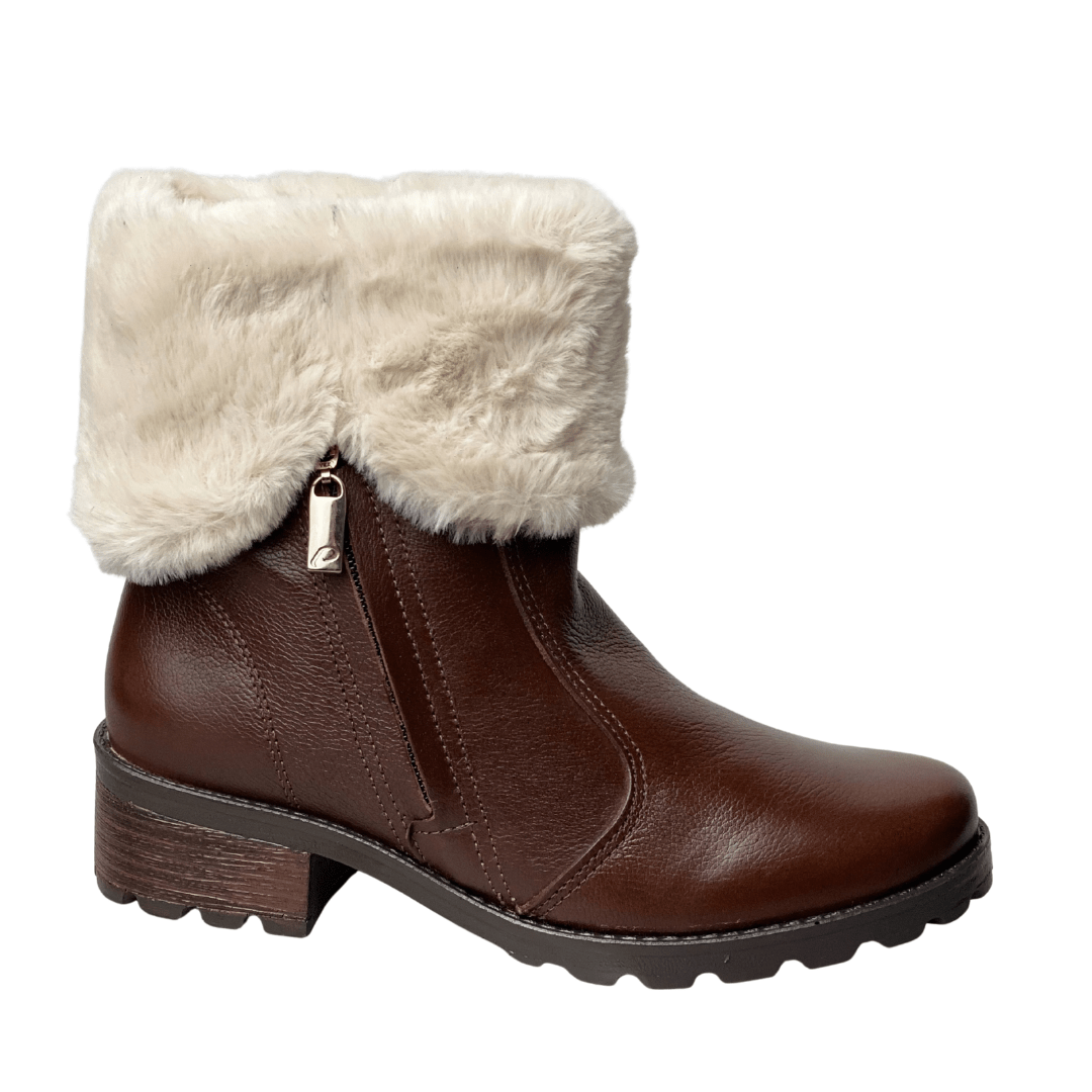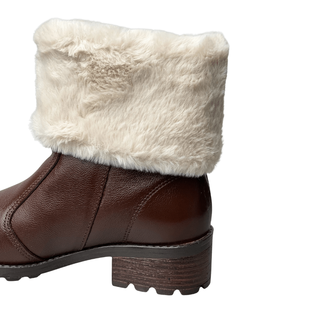 Detalhe de Inverno: Cano médio finalizado com uma gola de pelos sintéticos ultra macios em tom off-white.