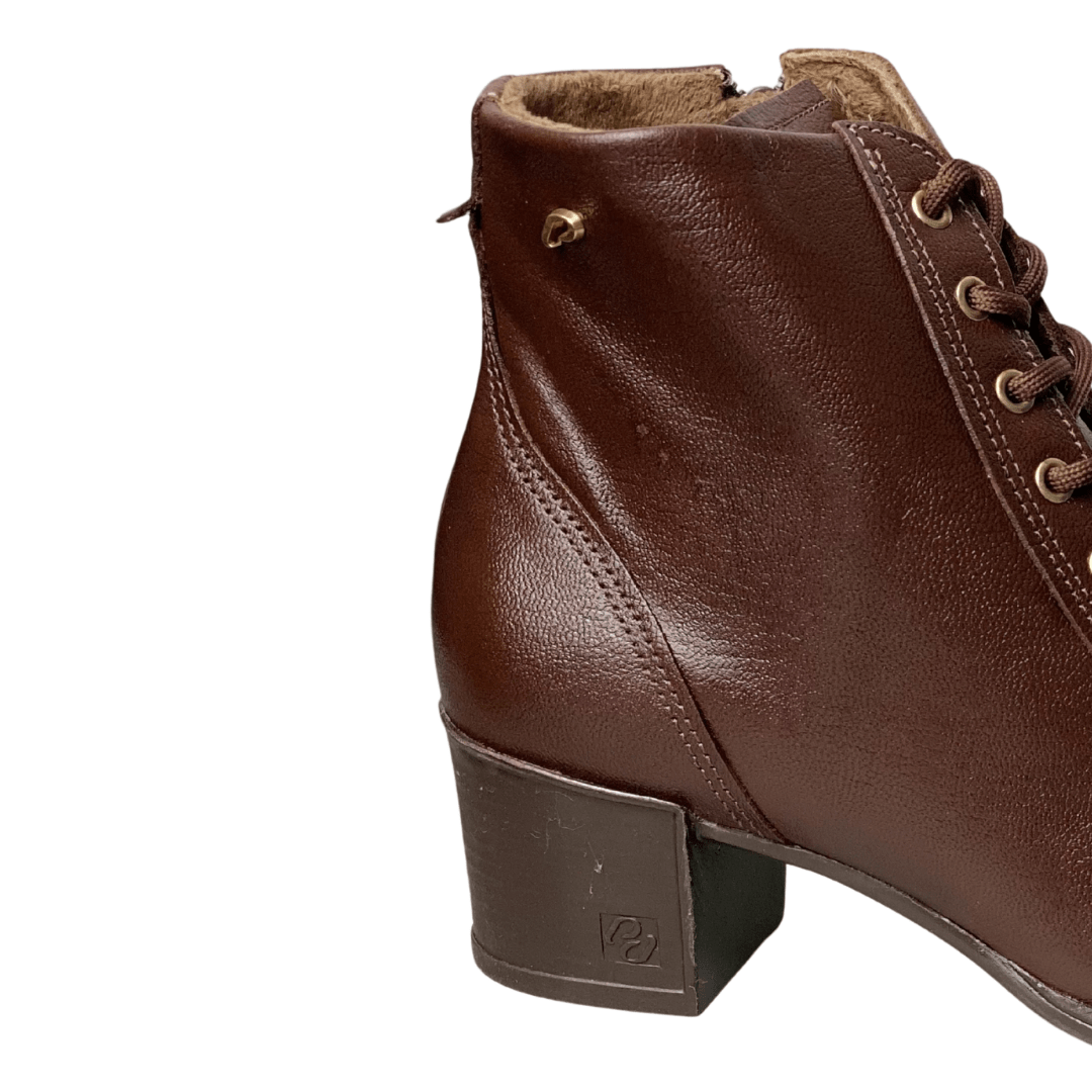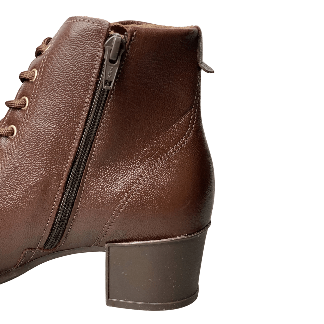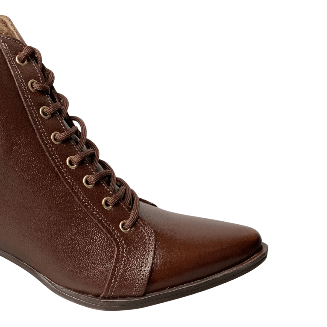 Fechamento: Cadarço frontal com ilhoses metálicos discretos e zíper lateral para facilitar o calce.