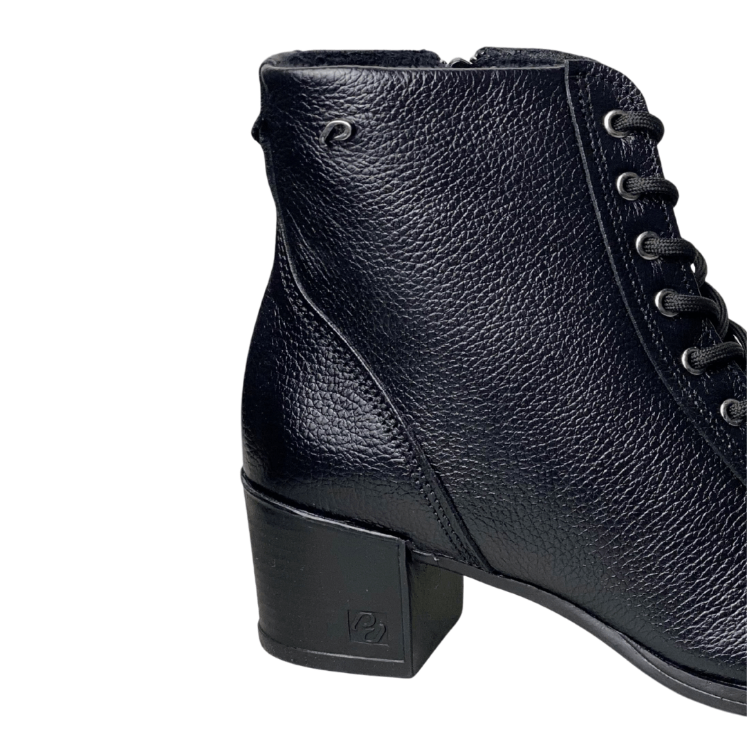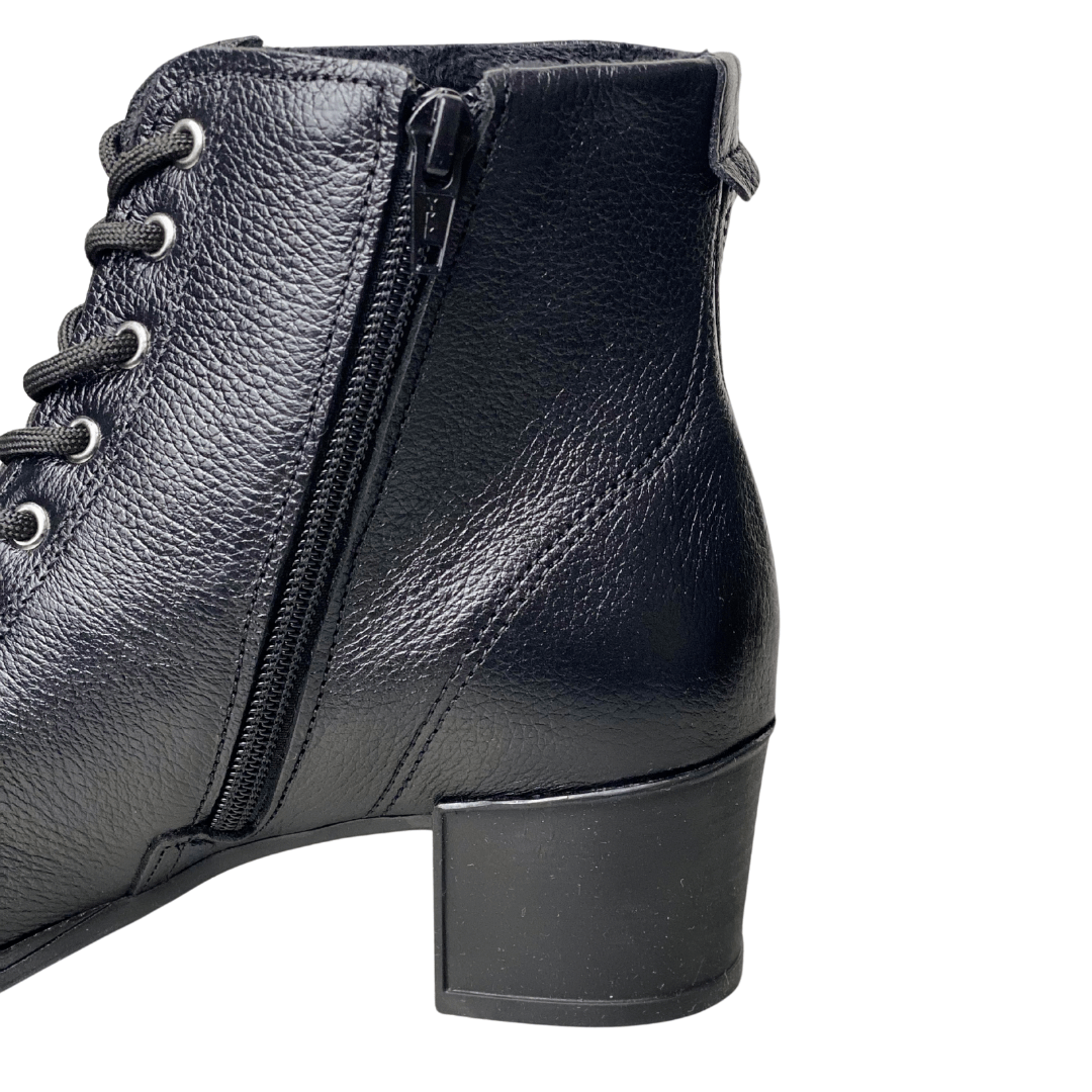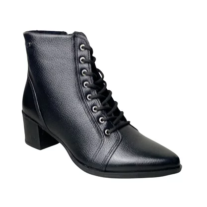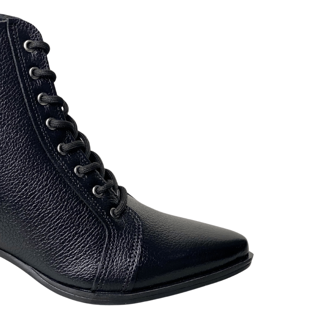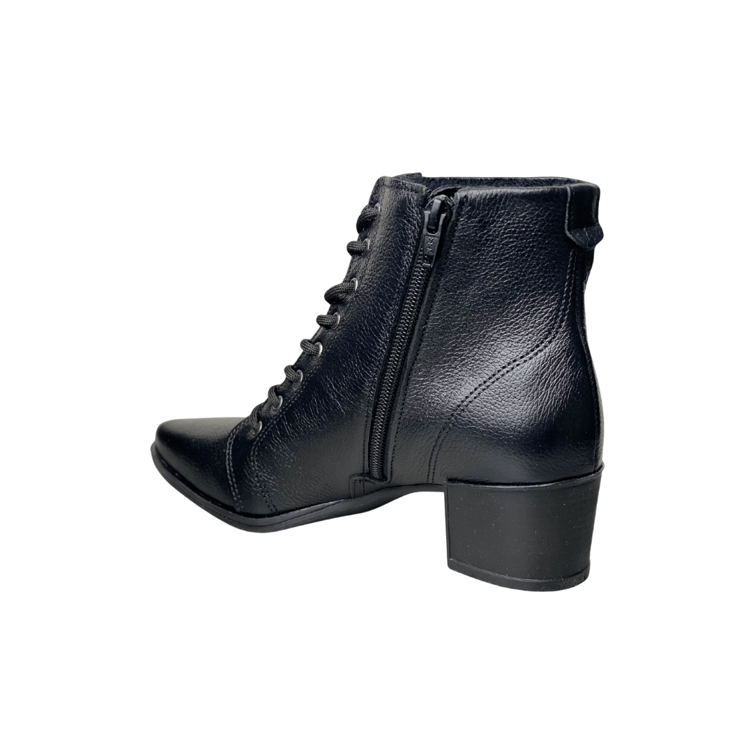 Fechamento: Cadarço frontal com ilhoses metálicos discretos e zíper lateral para facilitar o calce.