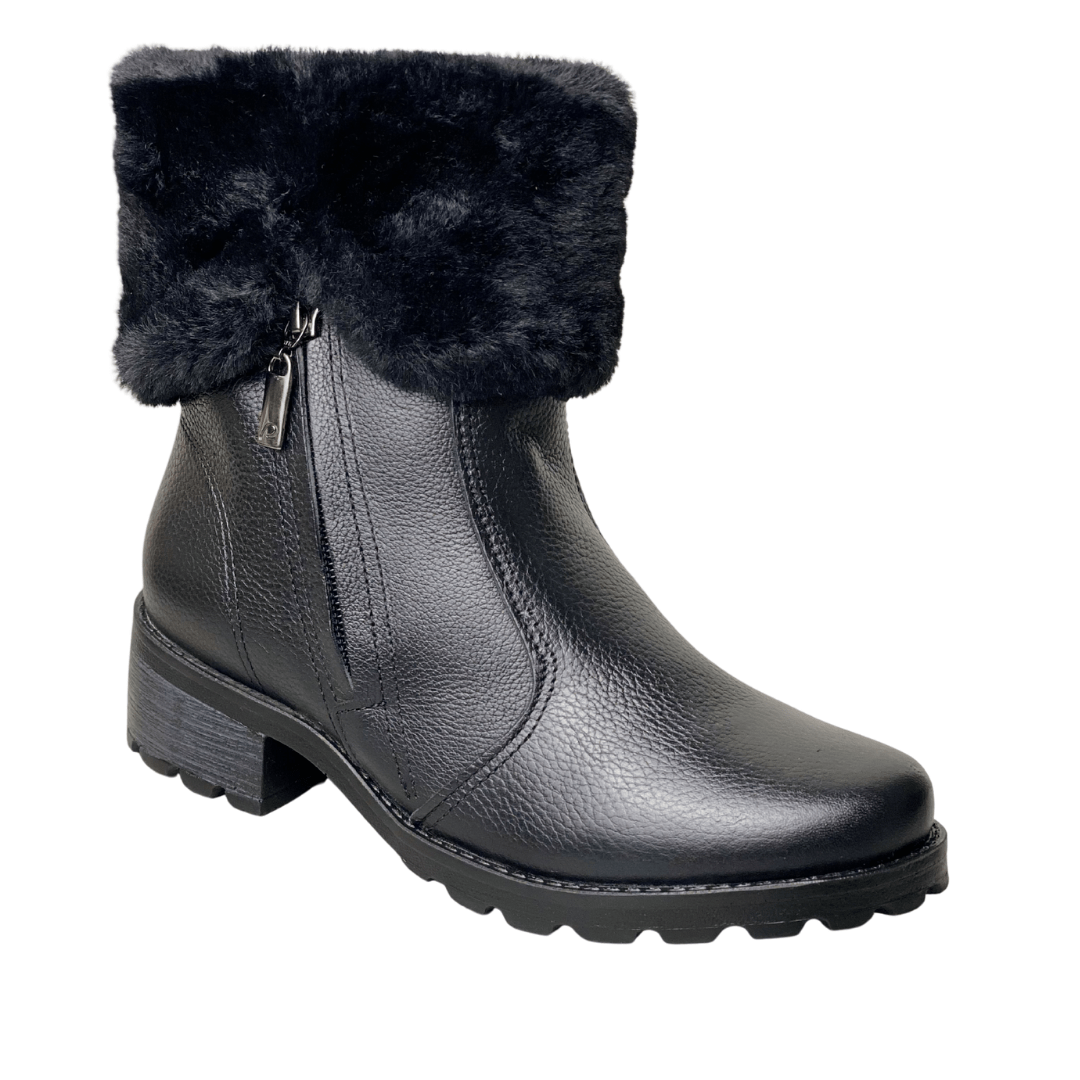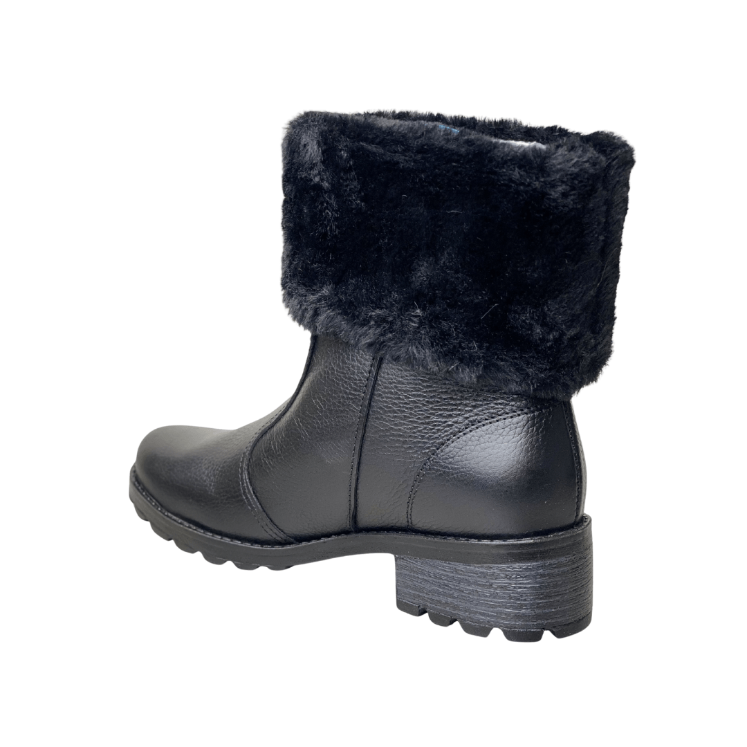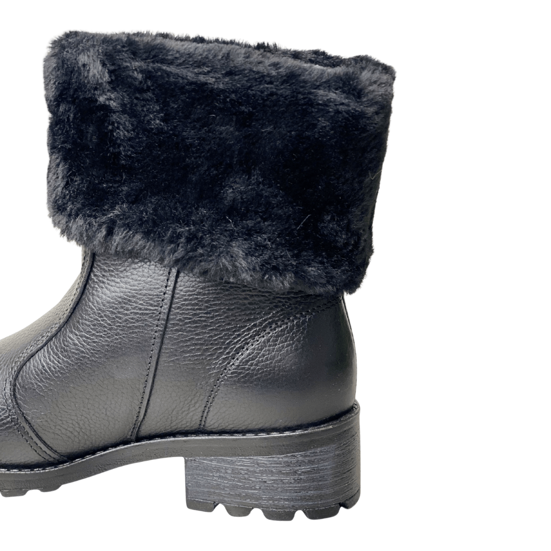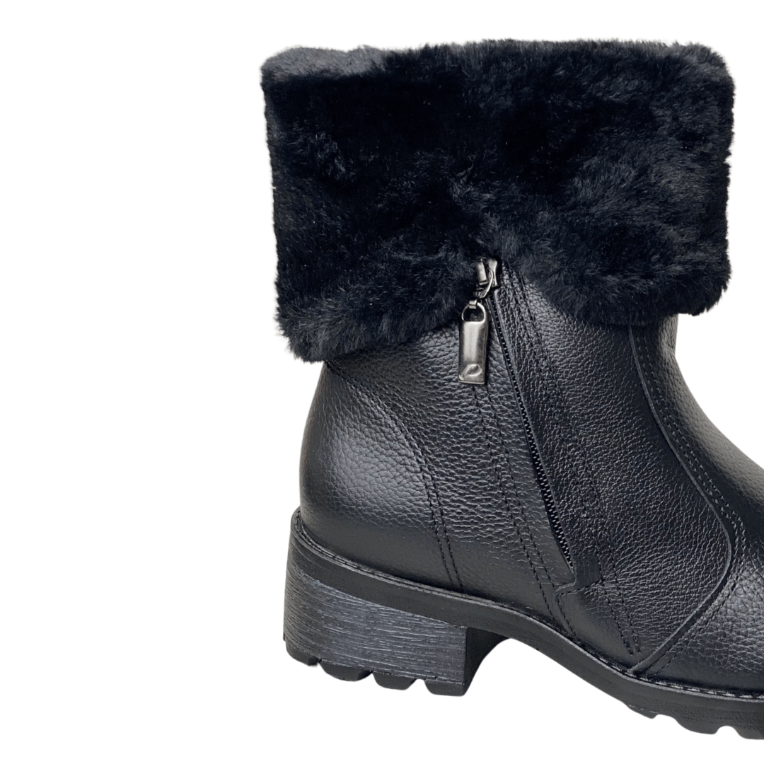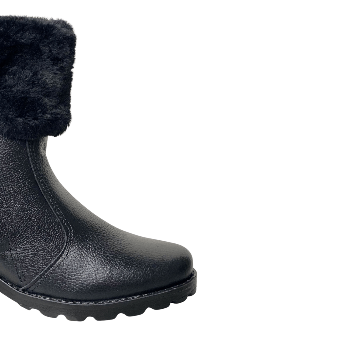 Detalhe de Inverno: Cano médio com gola de pelos sintéticos volumosos e macios na cor preta.