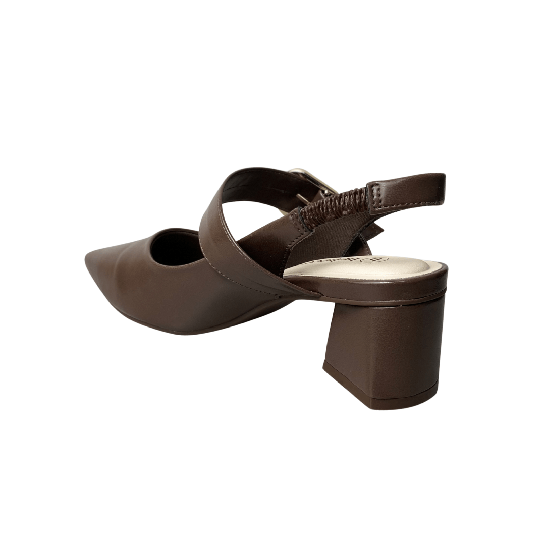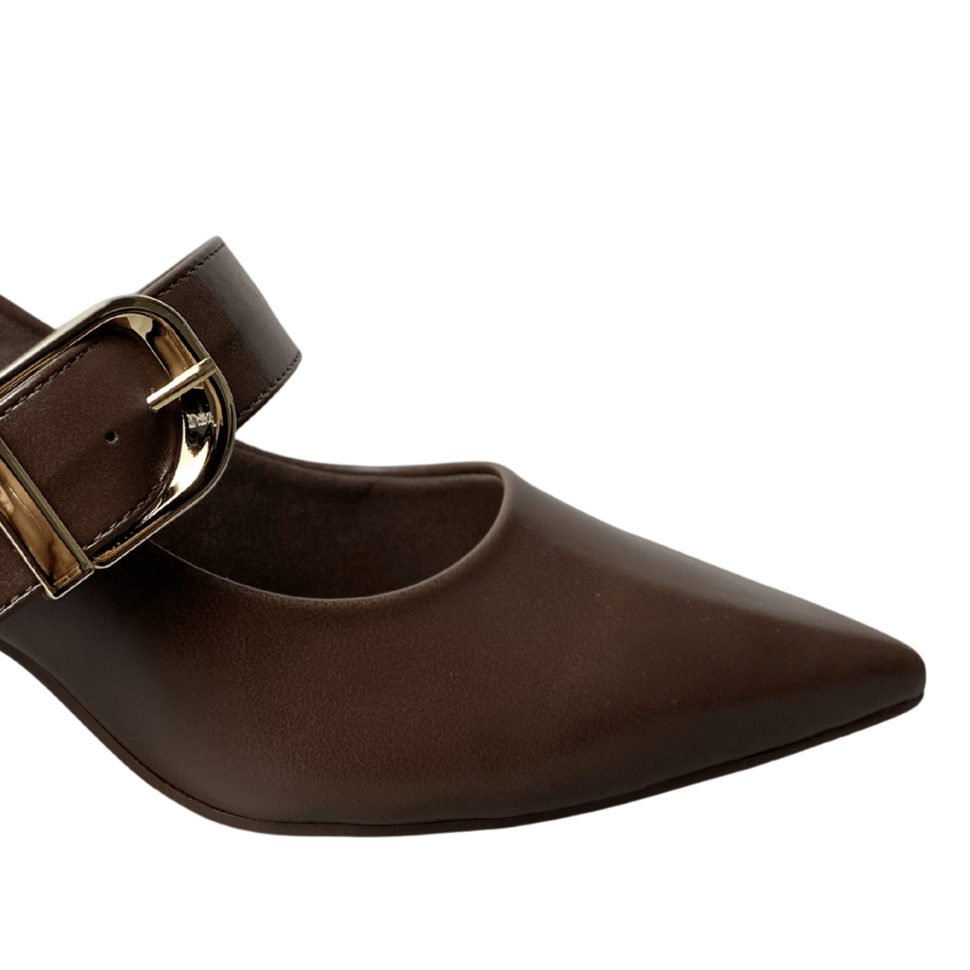 Design: Modelo Chanel com bico fino e detalhe de fivela dourada lateral.