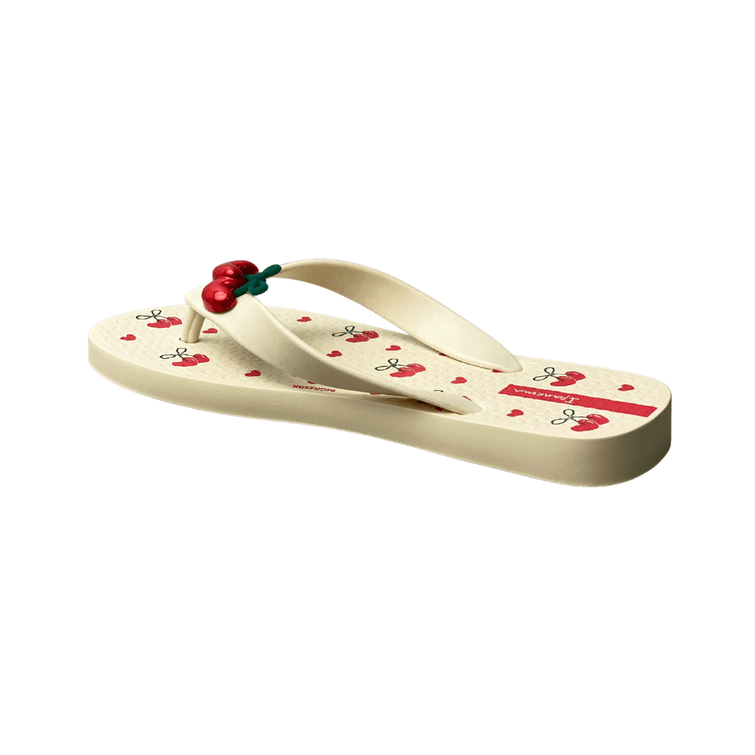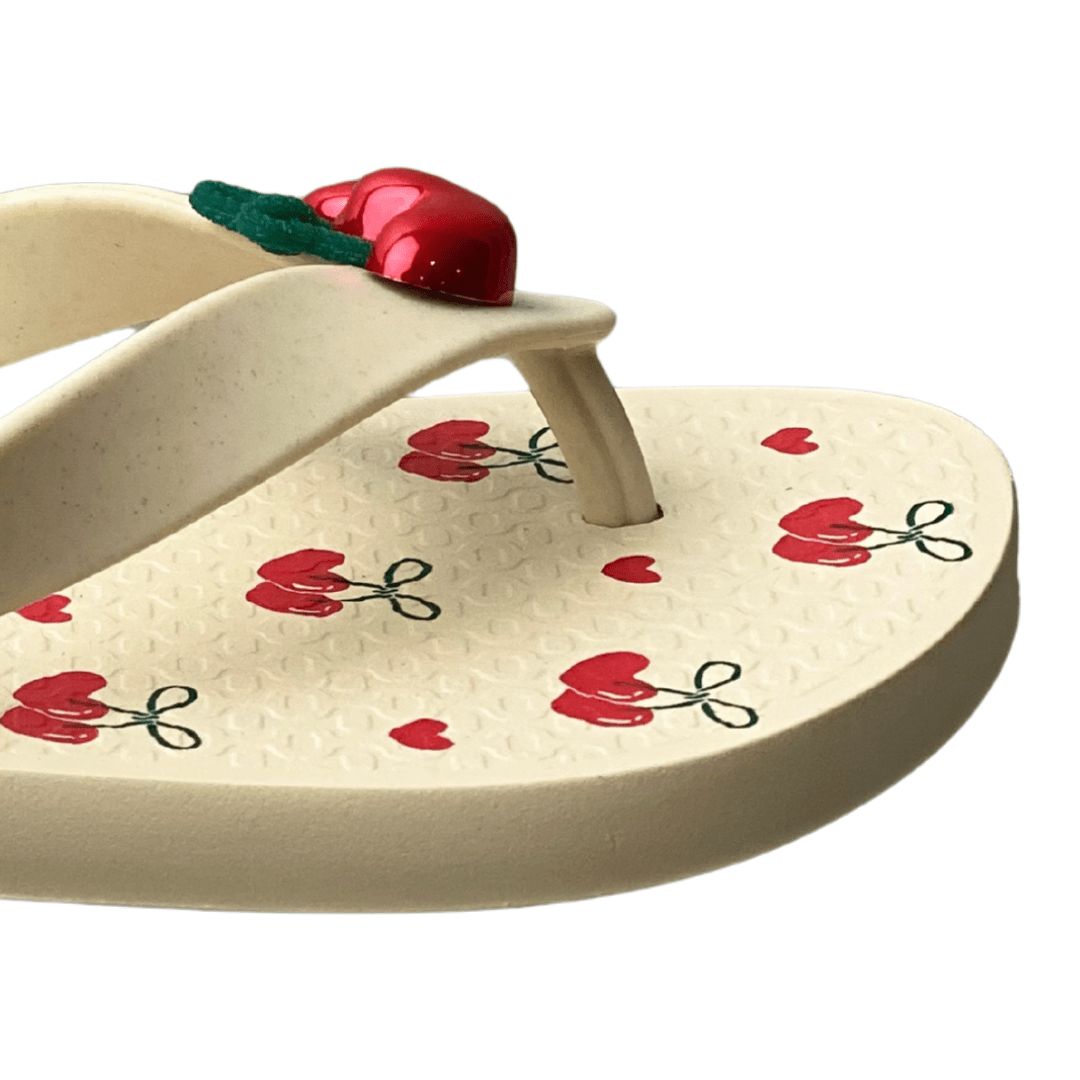 Detalhe Lúdico de Cereja: O aplique 3D de cereja na tira é o ponto alto, transformando o chinelo em um item temático e charmoso.