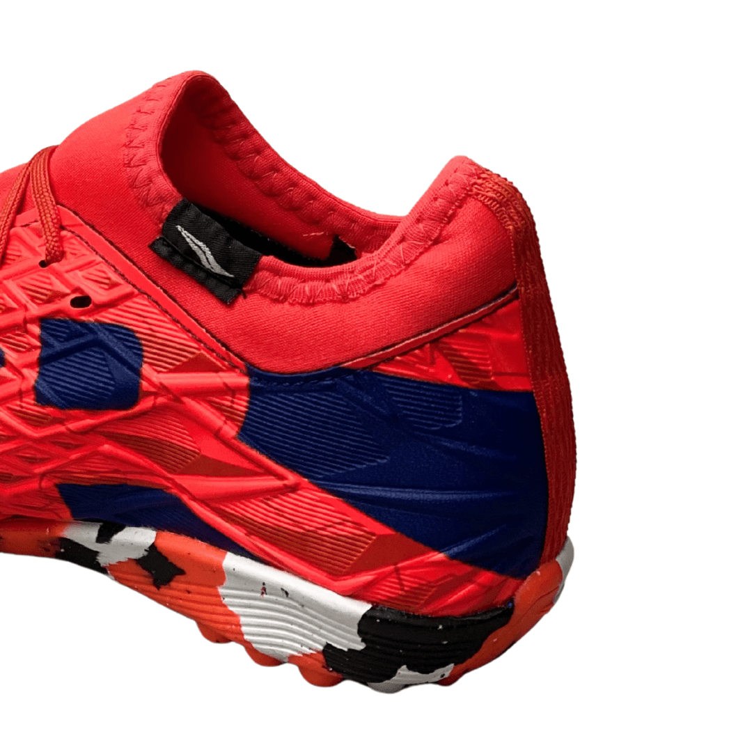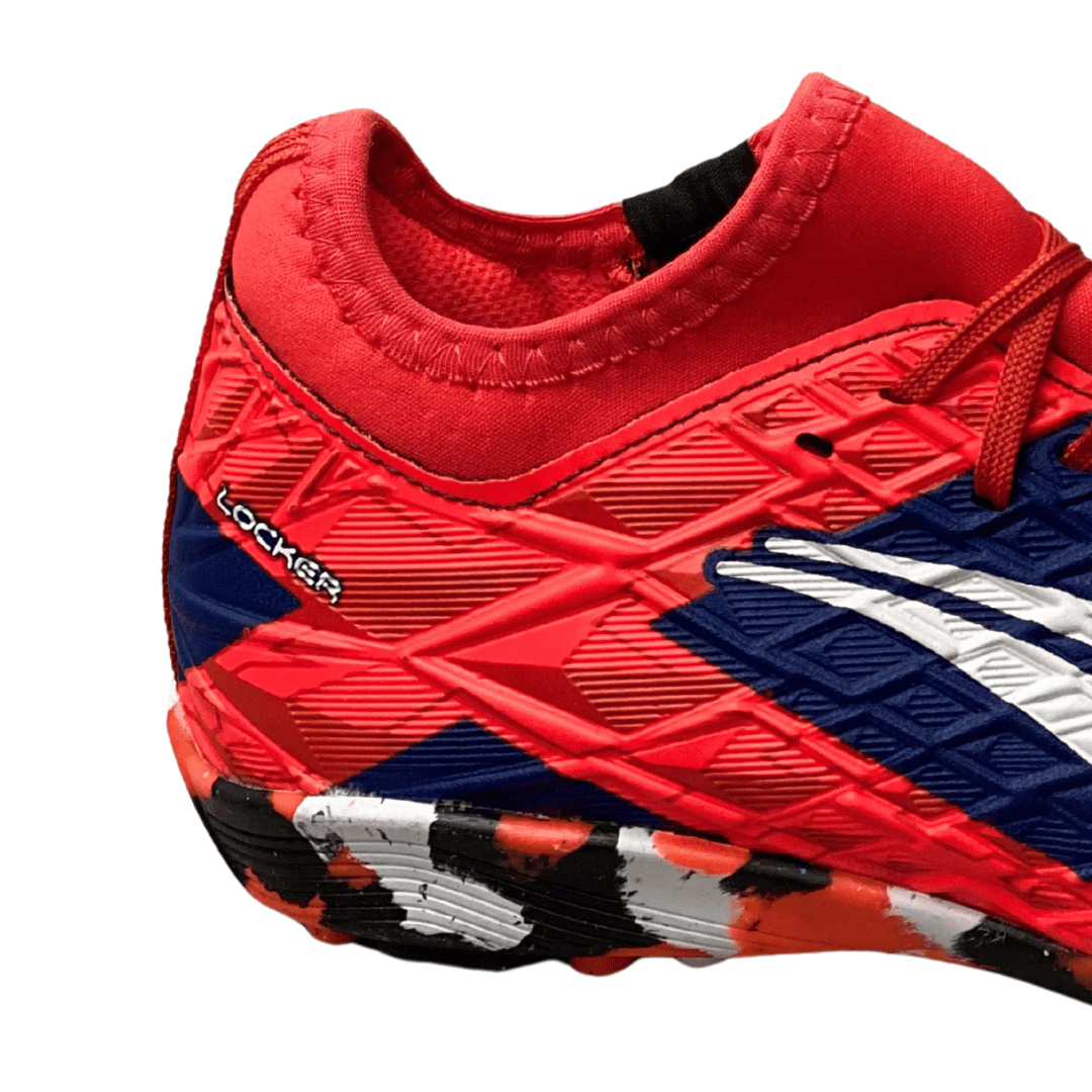 Design moderno e marcante: Com cores vibrantes — marinho, vermelho e branco — essa chuteira destaca estilo e atitude dentro e fora do campo.