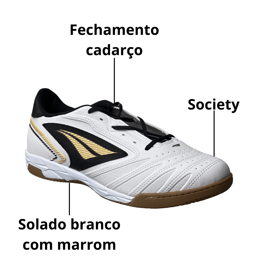 Fechamento: Cadarço preto que oferece ajuste firme e um contraste moderno com o corpo branco da chuteira.