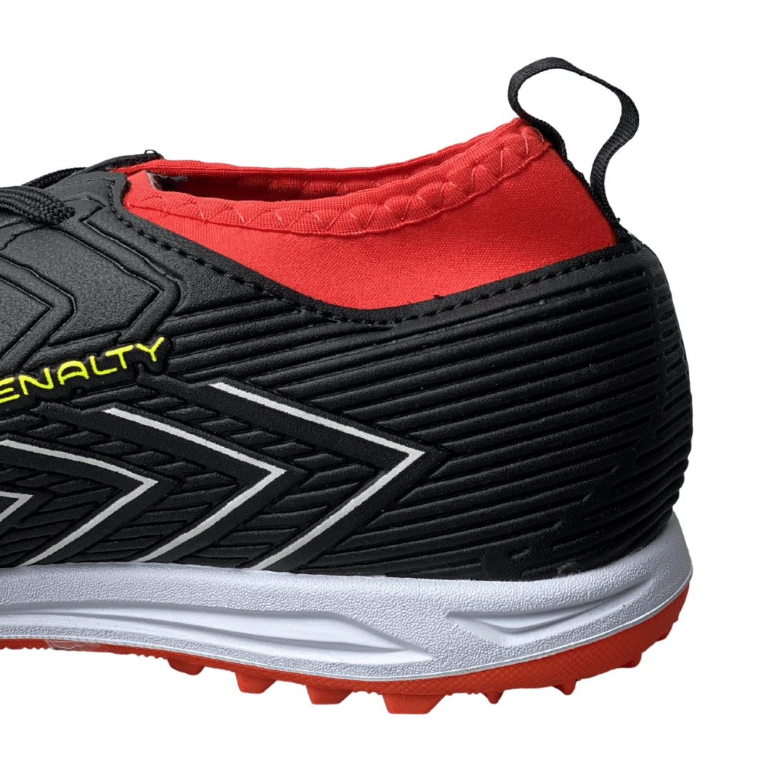 Cores: Preto predominante com detalhes em vermelho vibrante e logotipo Penalty em branco.