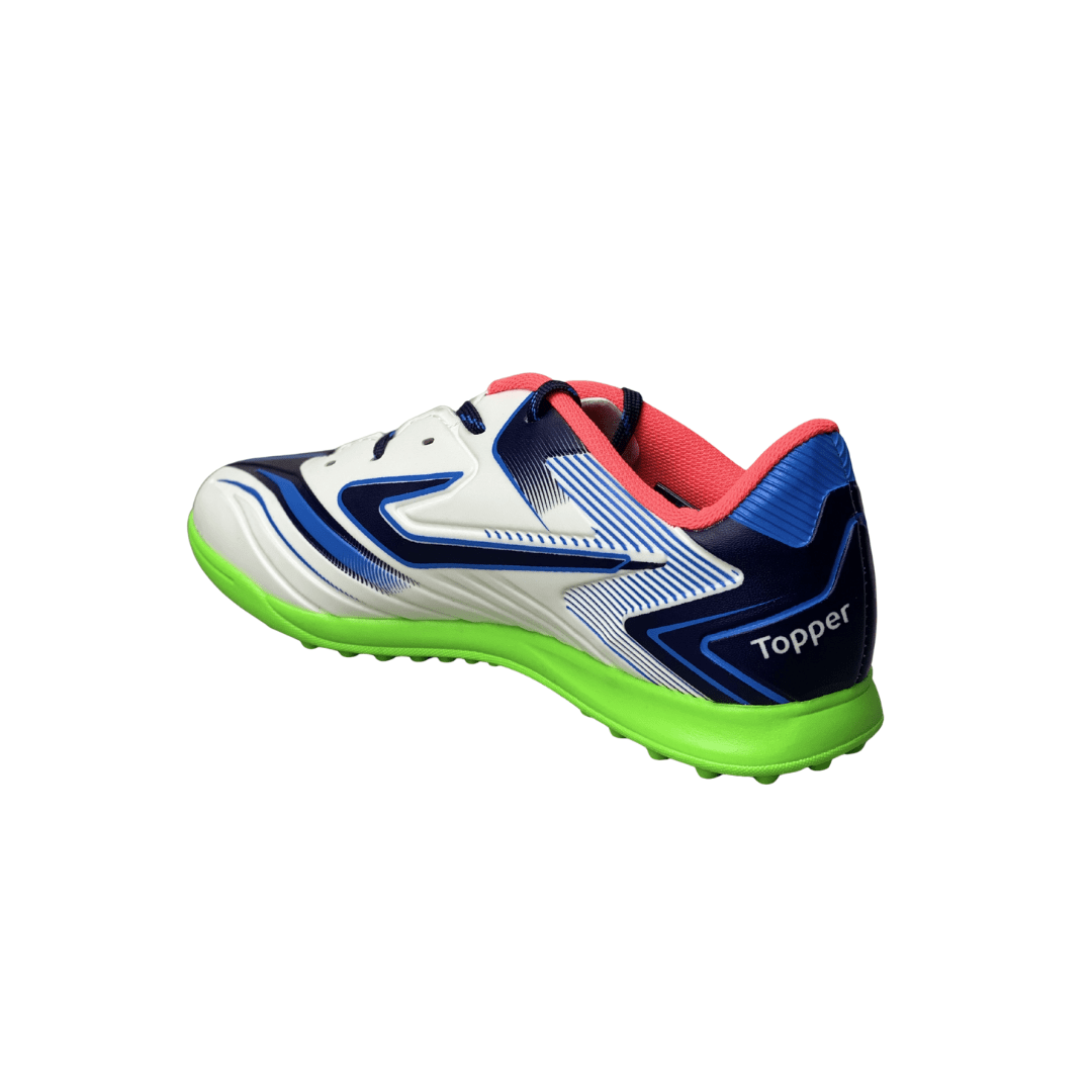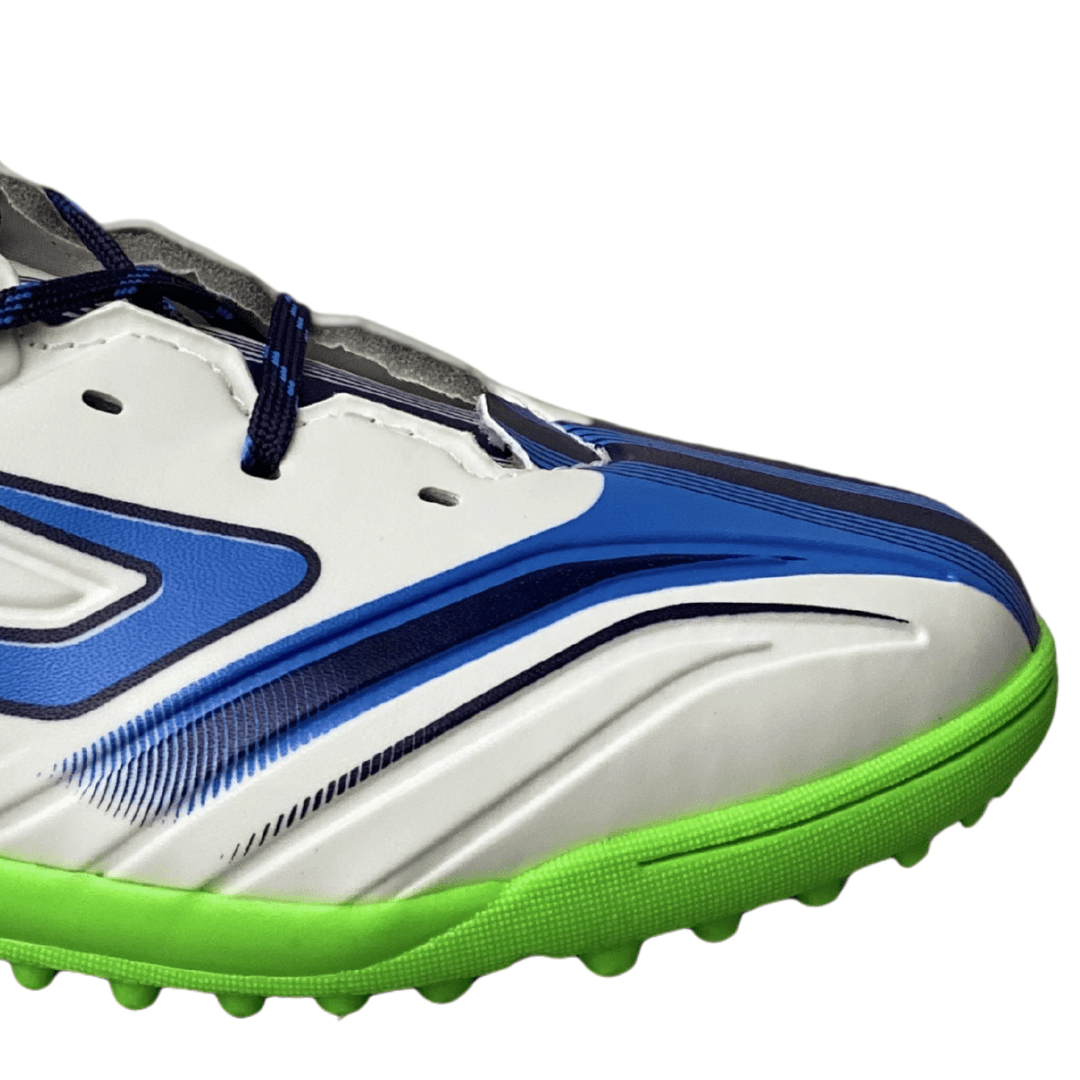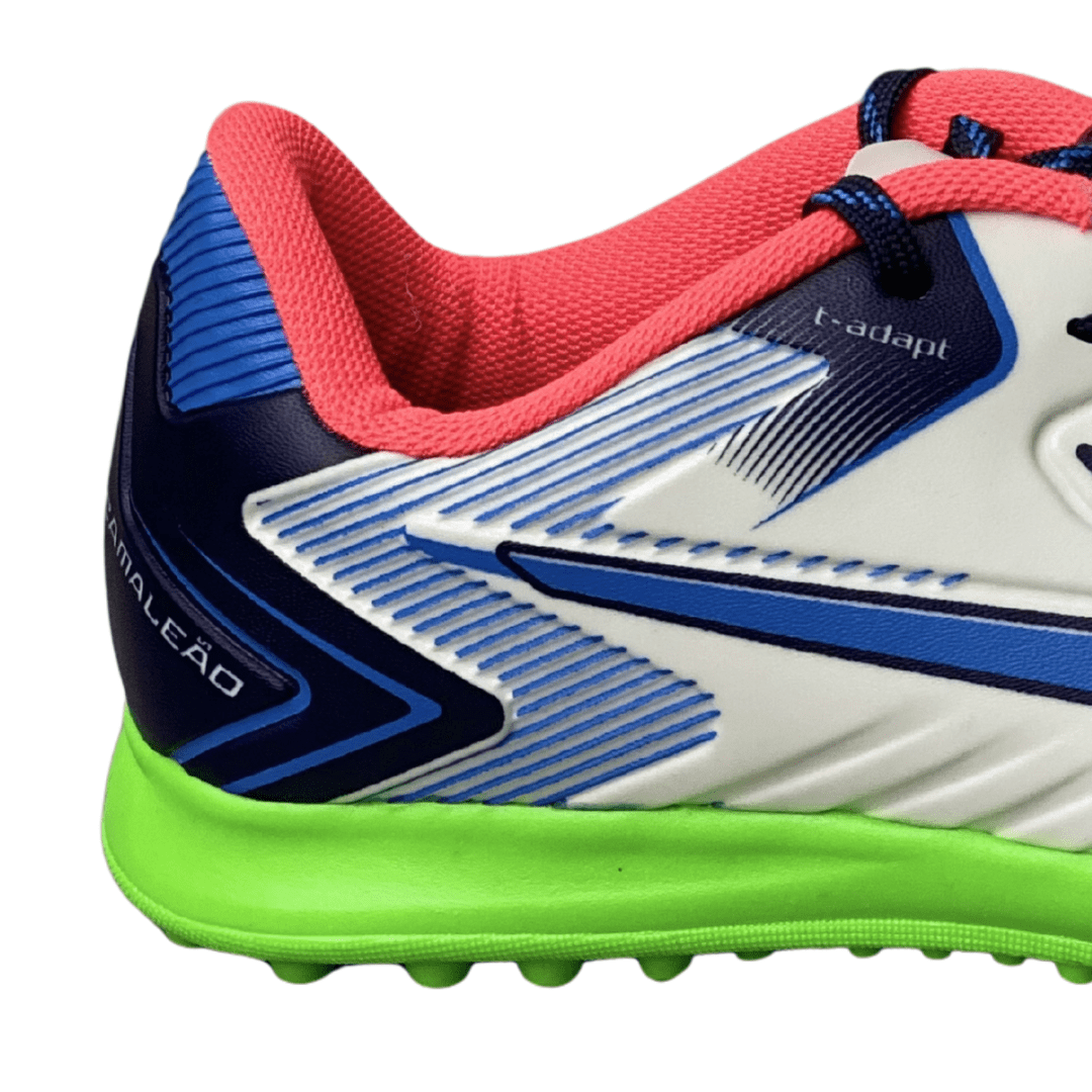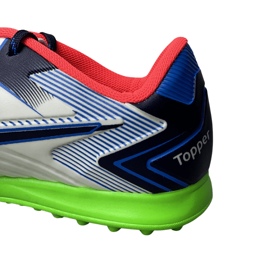 Solado: Borracha antiderrapante com tecnologia para gramados sintéticos.