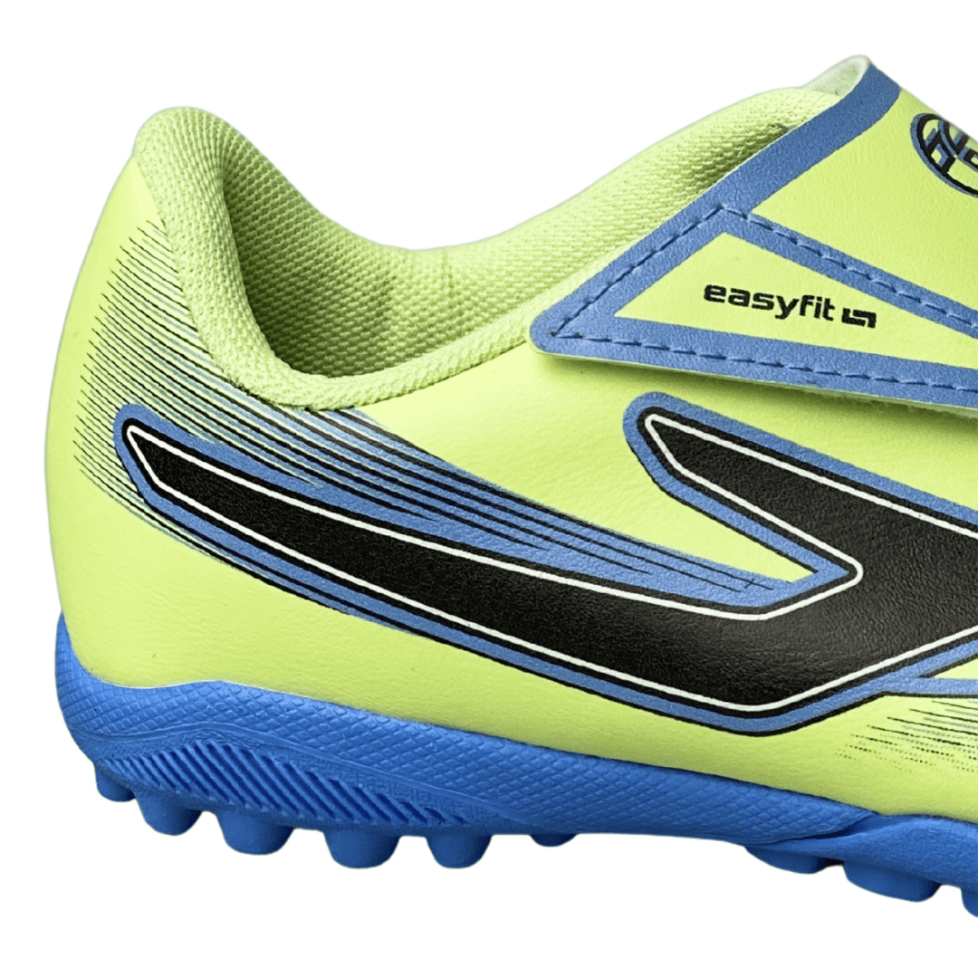 Praticidade Incomparável: Possui o sistema EasyFit, com fechamento em velcro largo que substitui os cadarços, permitindo que a própria criança calce e ajuste a chuteira com facilidade e autonomia.