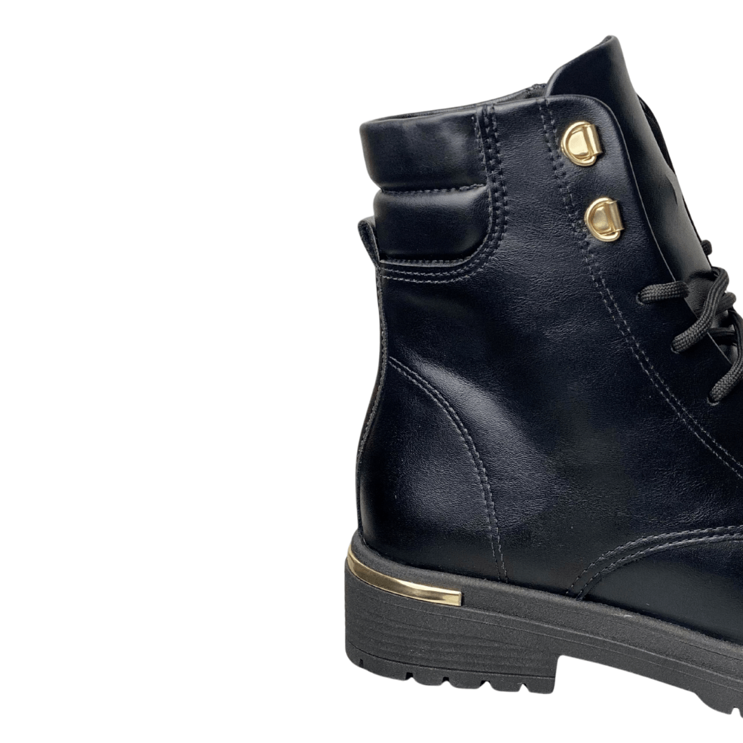 Detalhes Metálicos: Possui passadores de cadarço superiores em metal dourado e um friso metálico no calcanhar, agregando um toque de luxo.
