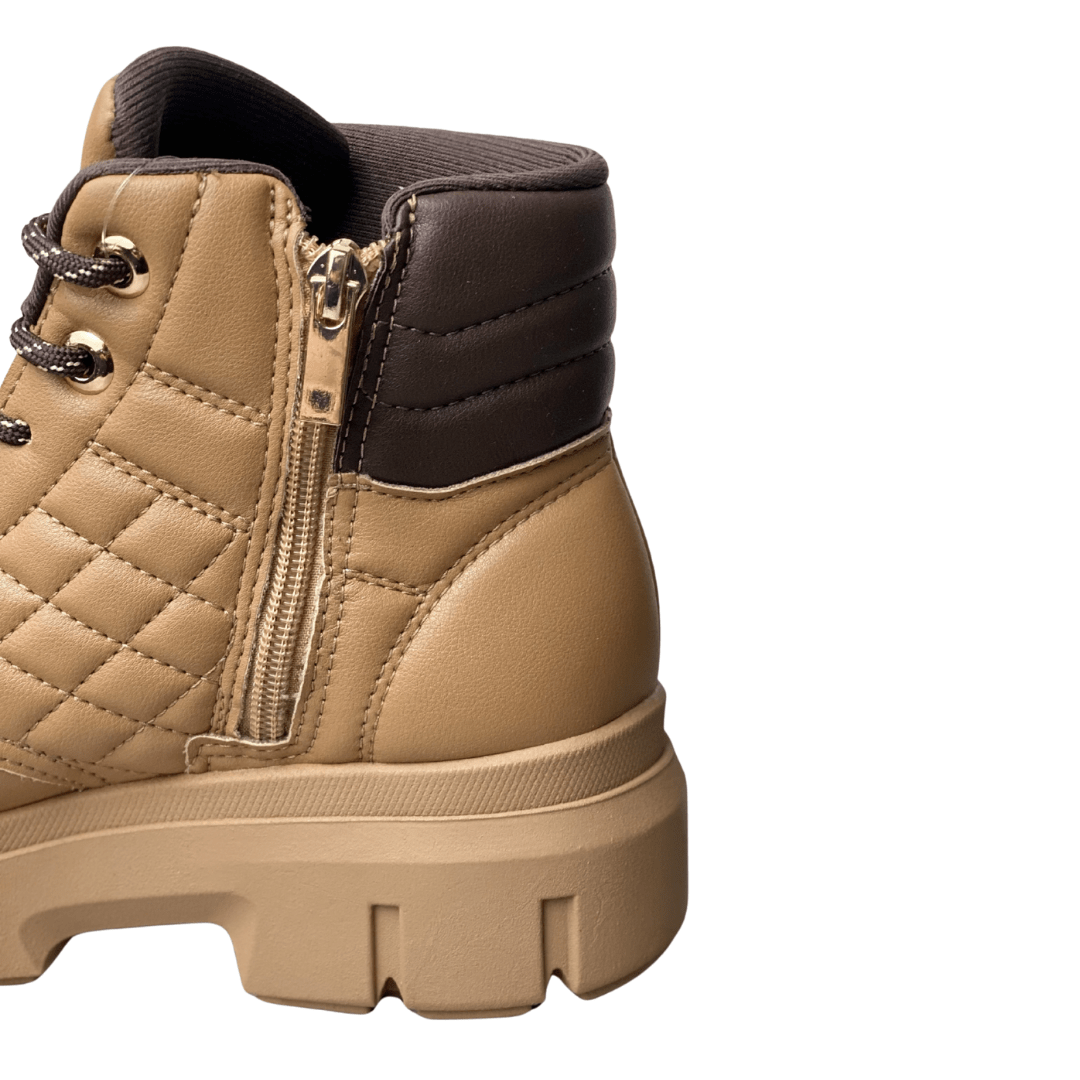 Solado: Plataforma tratorada robusta na cor camelo, harmonizando com o restante do calçado.