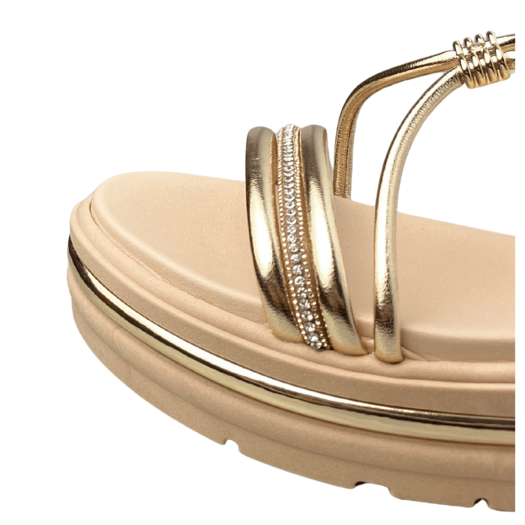 Detalhes: tira cravejada com pedrarias e acabamento metálico no solado