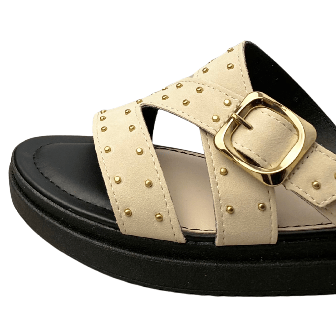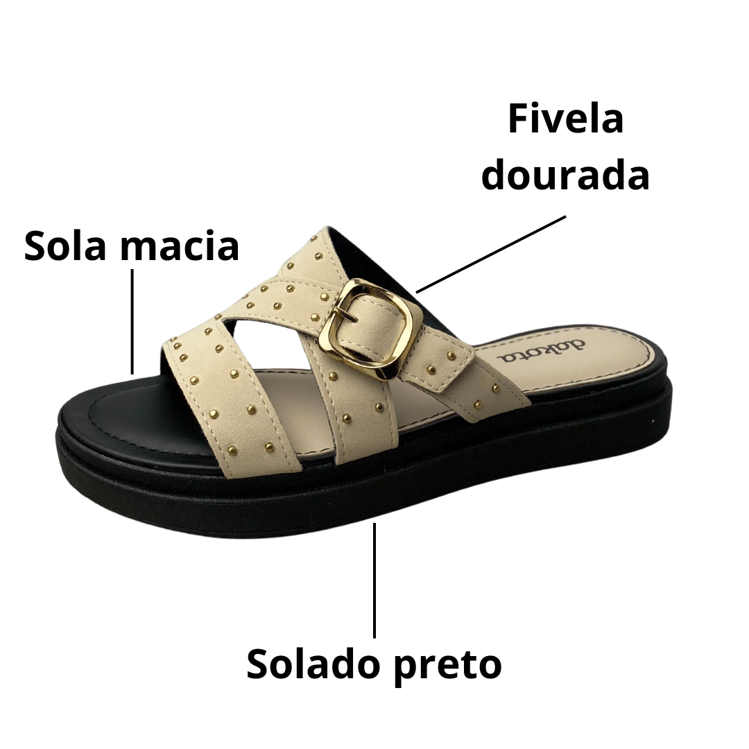 Estilo marcante: A fivela dourada em destaque e os detalhes em tachas aplicadas conferem um toque de sofisticação moderna que eleva qualquer look.