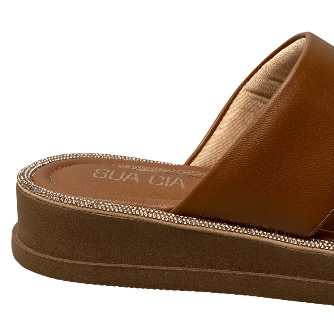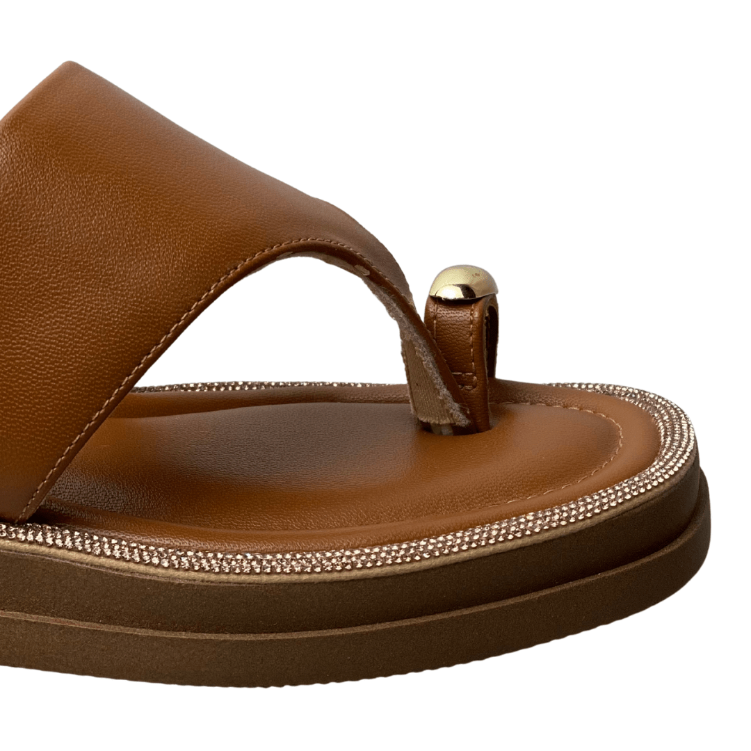 O design minimalista com detalhe dourado no cabedal valoriza o visual com elegância.