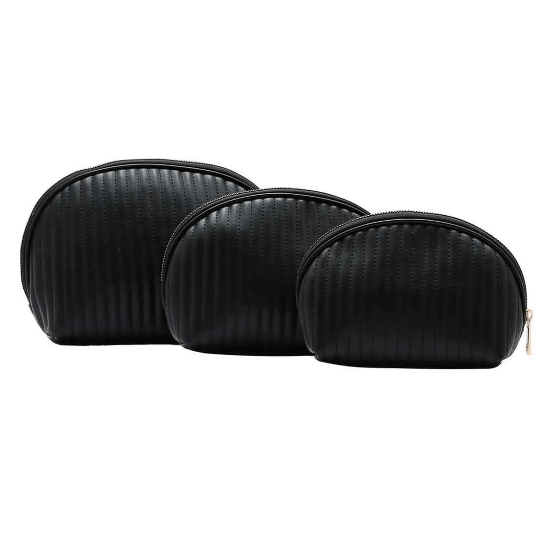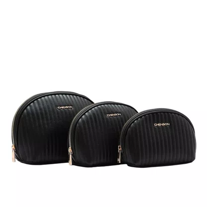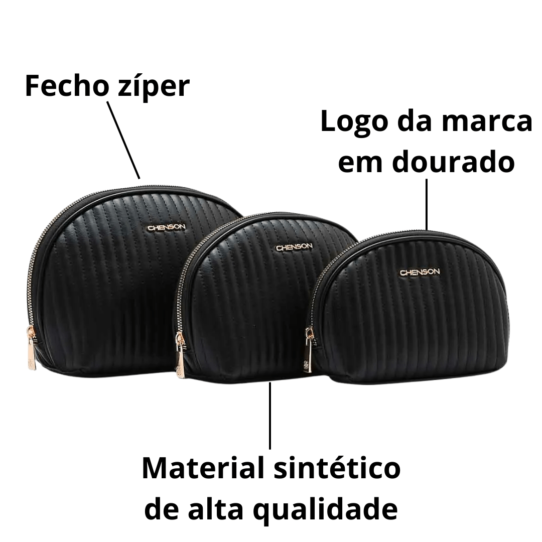 O Kit Necessaire Chenson foi desenvolvido para a mulher que valoriza a ordem e o estilo em todos os momentos. Apresentando um design arredondado moderno e costuras verticais elegantes, este conjunto de três peças é versátil o suficiente para acompanhar você desde a rotina diária na bolsa até viagens internacionais.