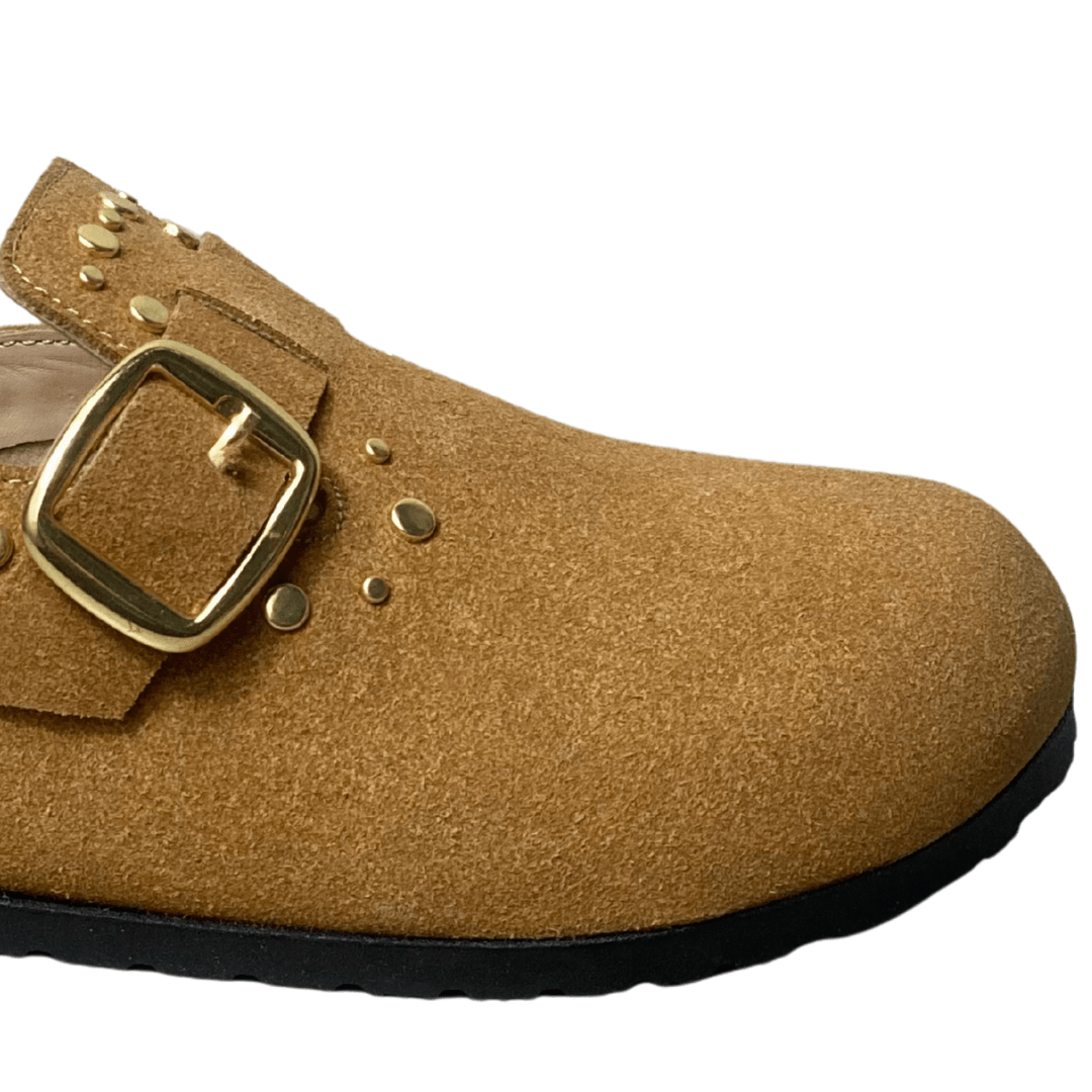 Visual Sofisticado: A combinação da cor caramelo com as tachas douradas cria um contraste elegante que valoriza qualquer combinação de roupa.