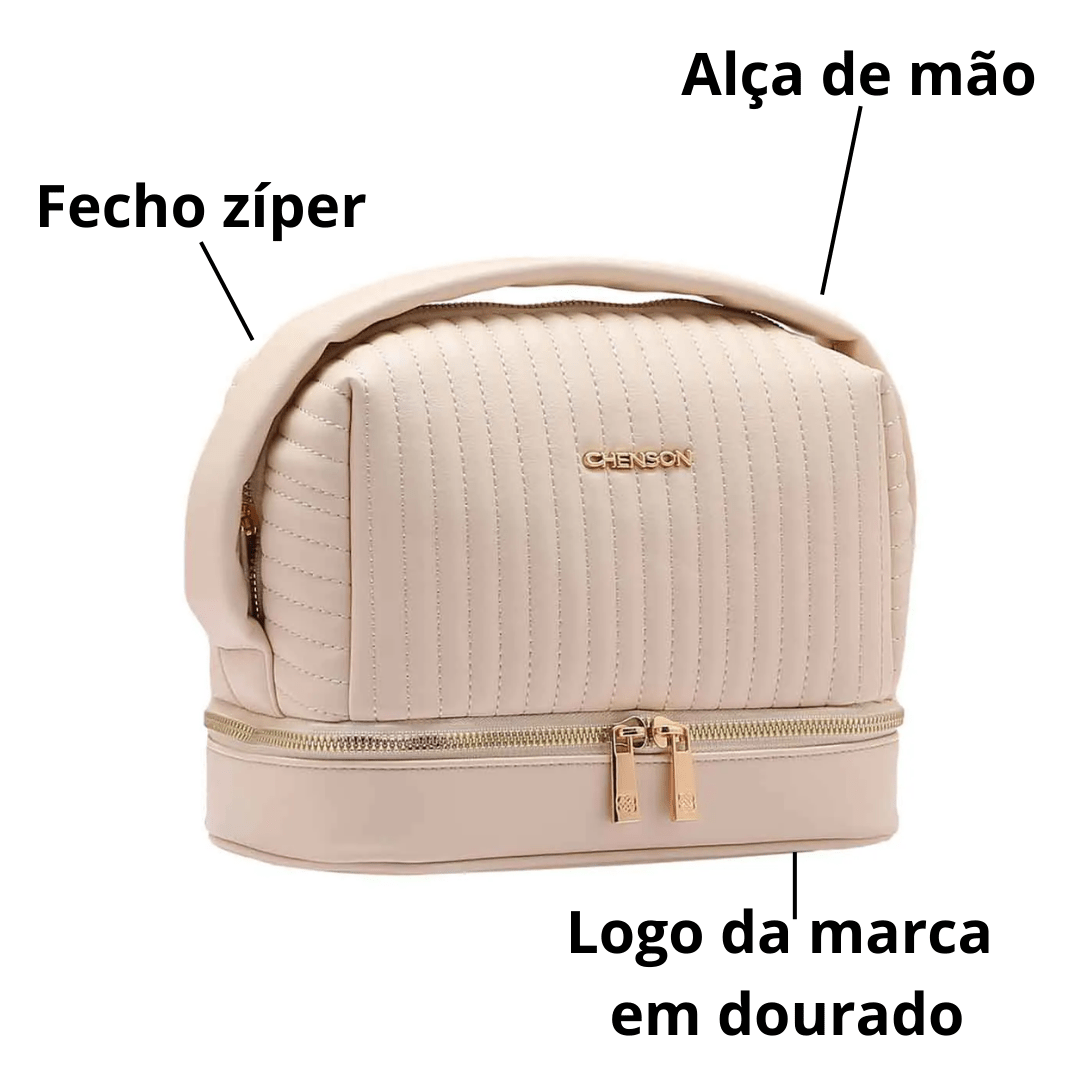 A Necessaire Chenson Nude é a combinação perfeita de funcionalidade e elegância. Desenvolvida para a mulher que não abre mão da praticidade, ela possui uma estrutura rígida e sofisticada, ideal para proteger e organizar seus produtos de beleza, maquiagem e higiene pessoal com a máxima segurança e estilo.
