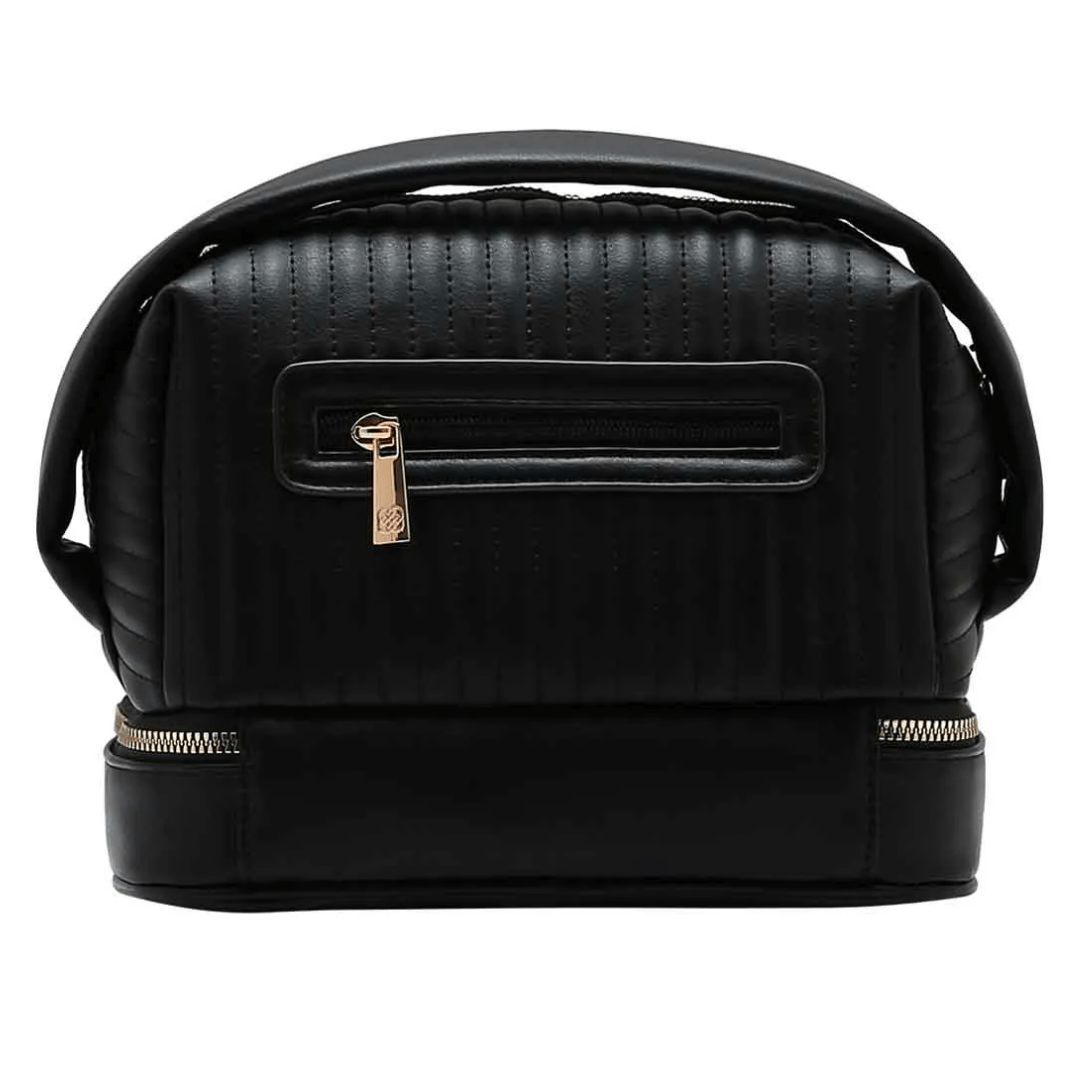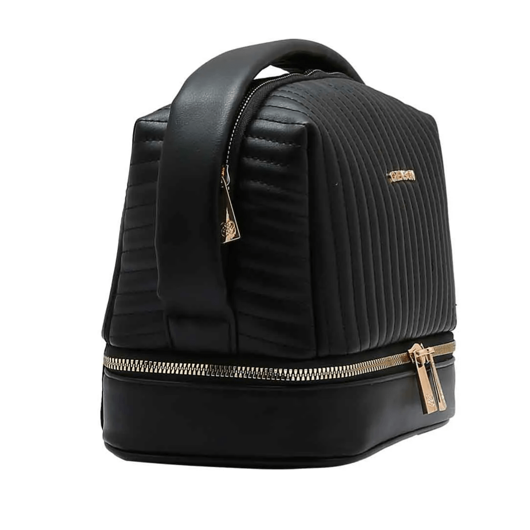 Utilize o compartimento superior para itens maiores como cremes, perfumes e shampoos. O compartimento inferior (com zíper duplo) é perfeito para organizar lápis, pincéis ou até mesmo joias e acessórios pequenos. É a escolha ideal para levar em viagens, na academia ou para manter a bancada do banheiro sempre impecável.