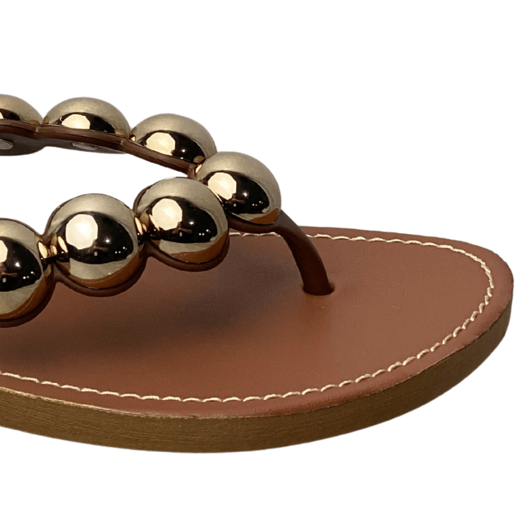 Brilho e Sofisticação: As ferragens em formato de esferas douradas captam a luz e trazem um ar moderno e luxuoso ao peito do pé.