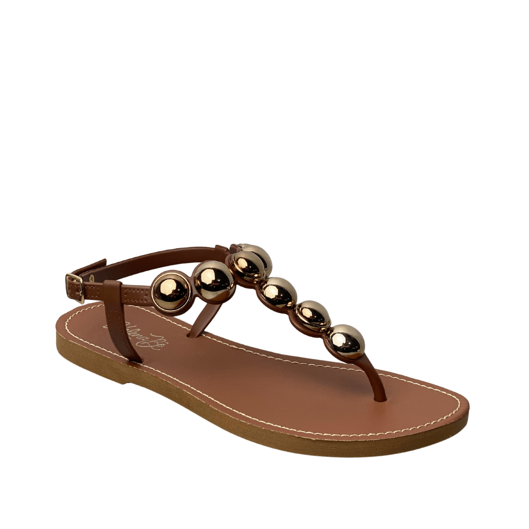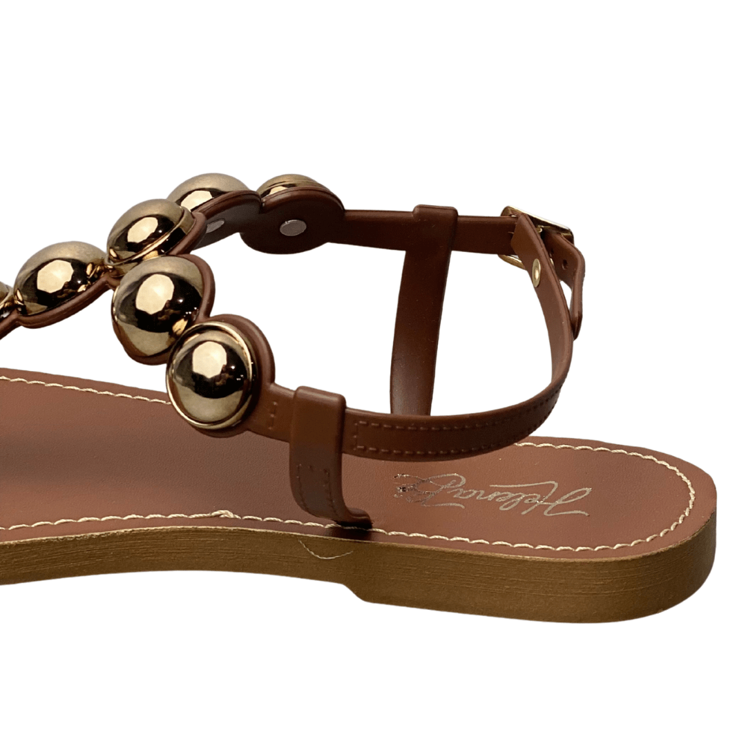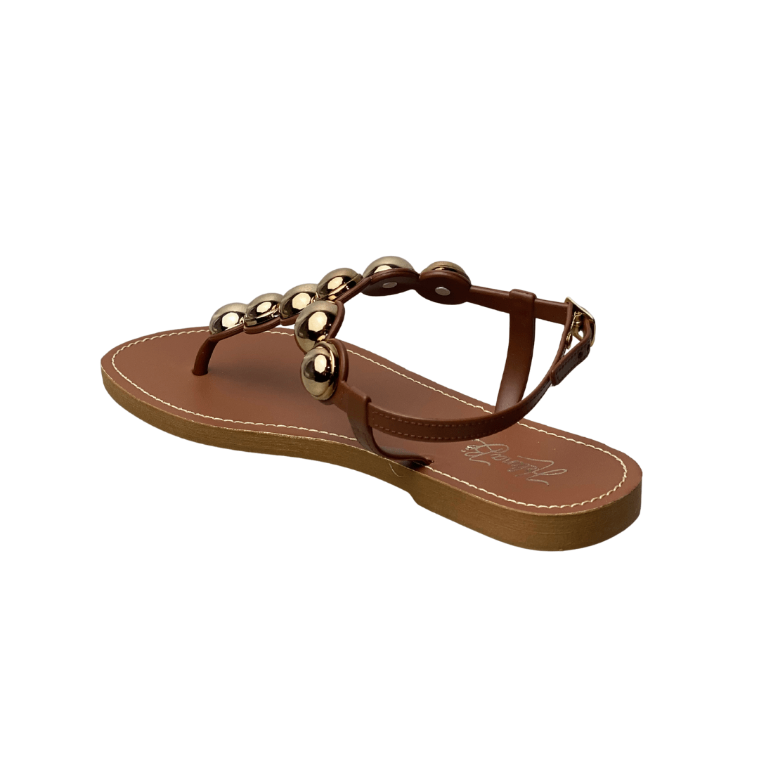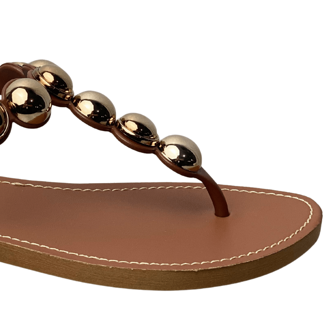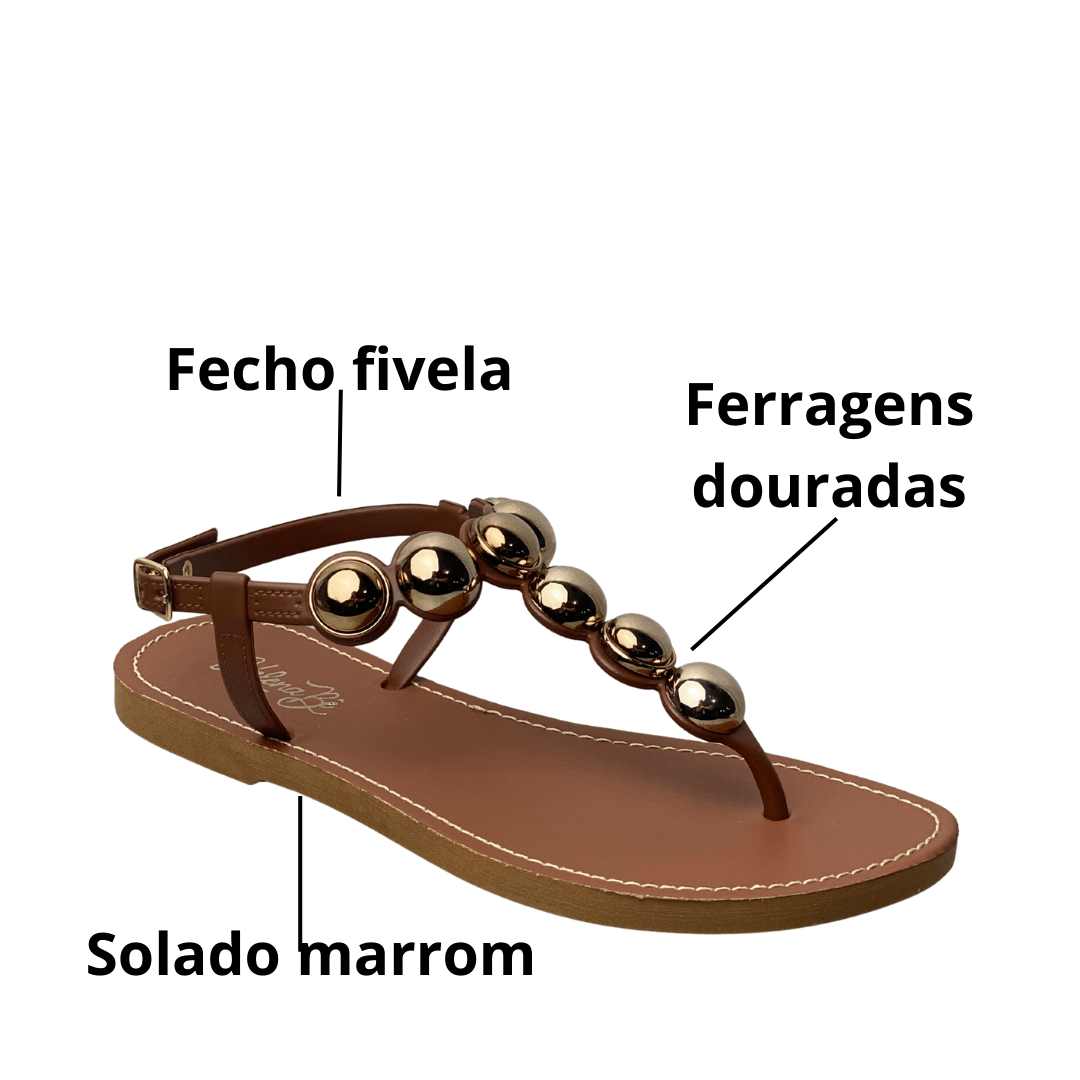 Design de Destaque: As esferas metálicas douradas na tira central funcionam como verdadeiras joias para os pés, elevando qualquer look casual.