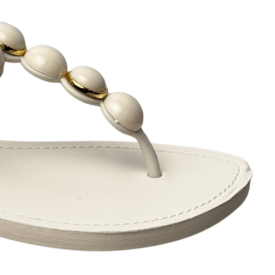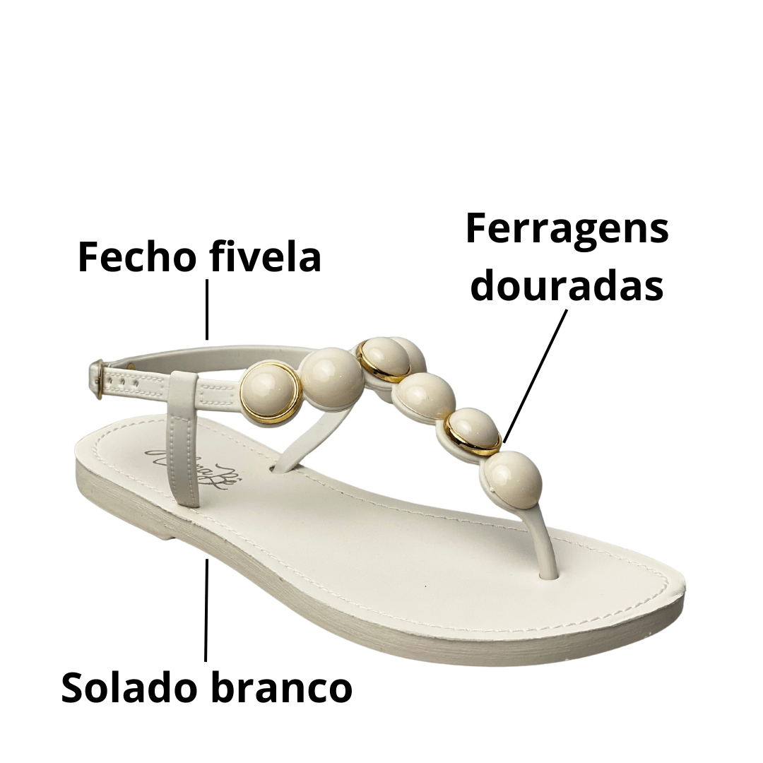 Design Luxuoso: As esferas em tom perolado com bases douradas criam um ponto de luz e sofisticação no peito do pé, elevando qualquer look básico.