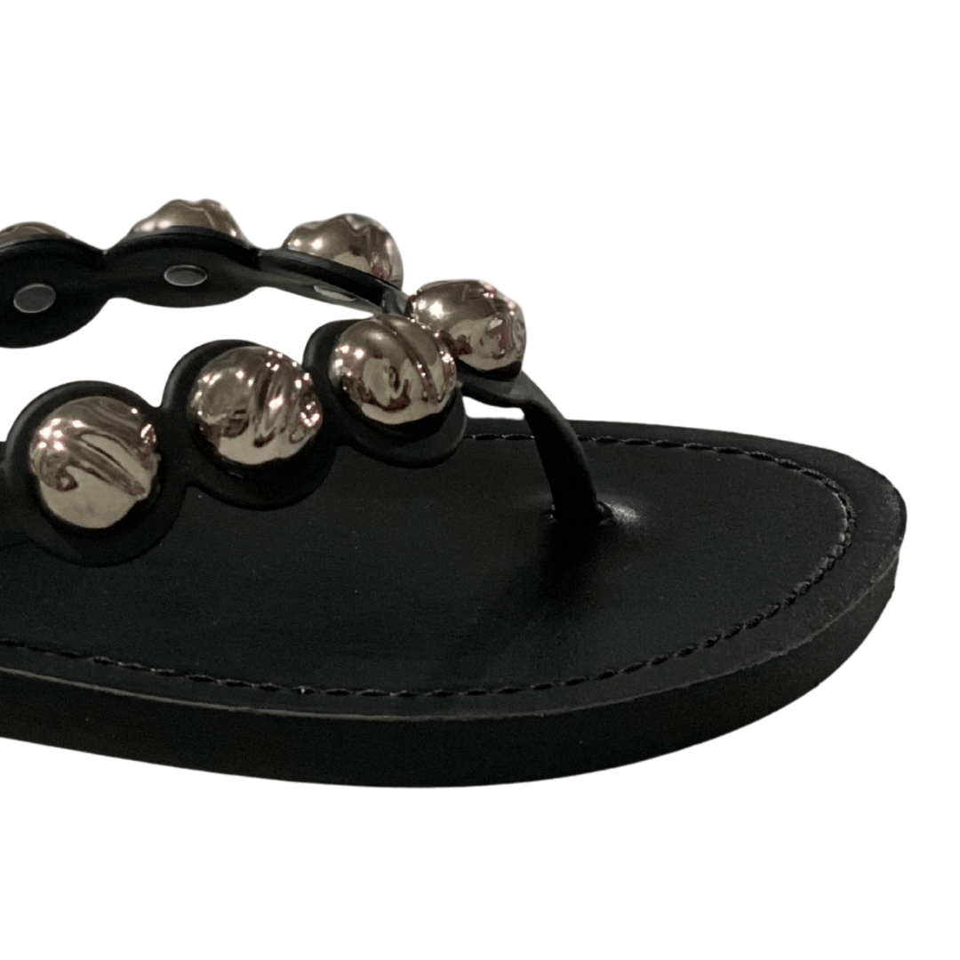 Toque de Sofisticação: As ferragens em formato de esferas metálicas elevam o design básico da rasteirinha, transformando um item casual em uma peça de destaque no visual.