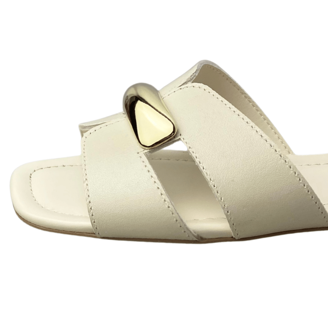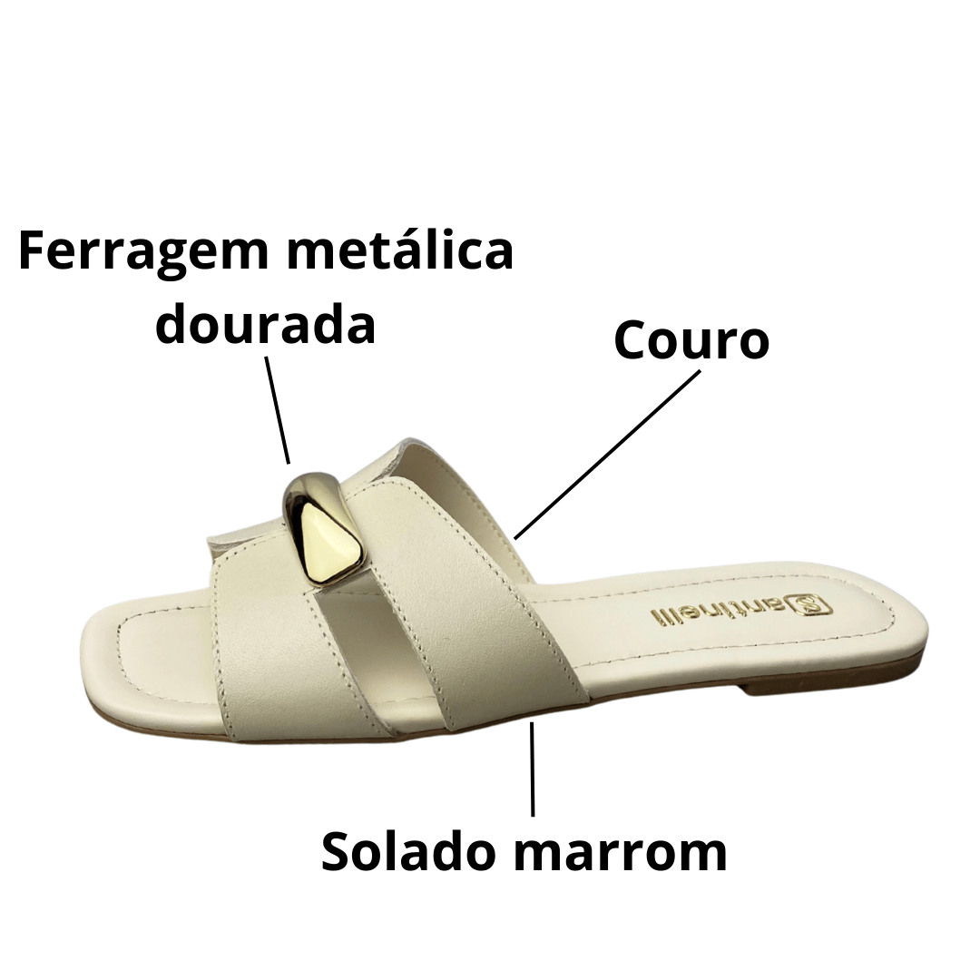 Detalhe em metal dourado no cabedal, trazendo charme e sofisticação.