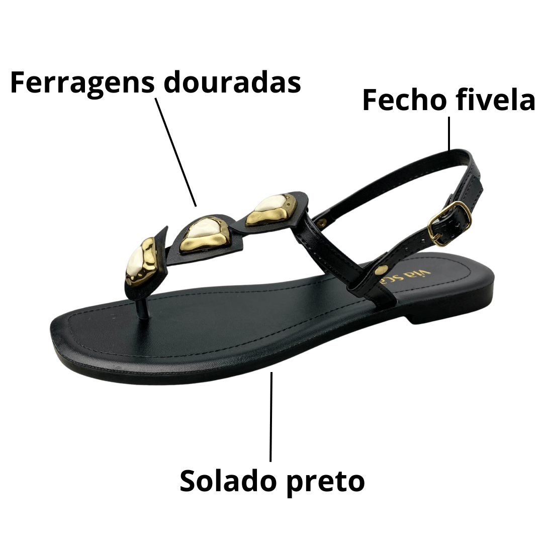 Detalhes em ferragens douradas que elevam o charme da rasteirinha.