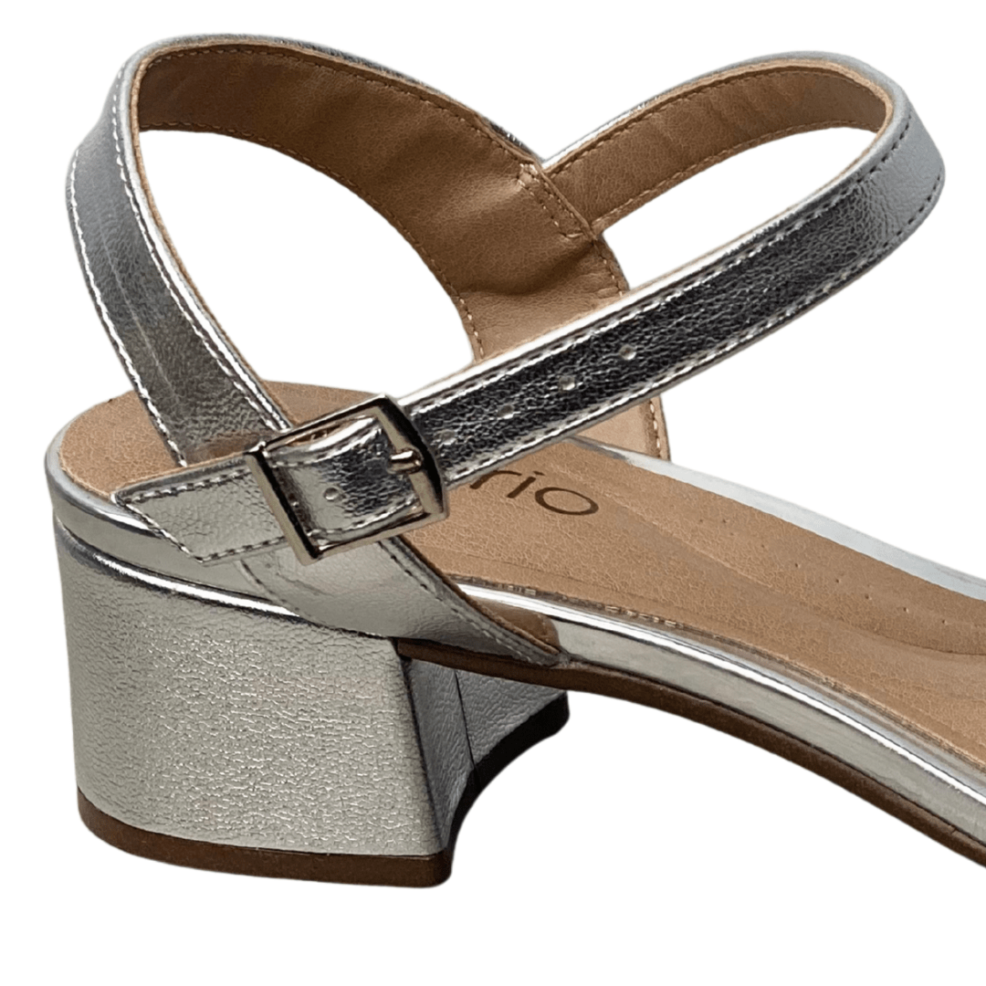 Salto: Estilo bloco (block heel) de altura baixa/média, revestido no mesmo material metalizado.