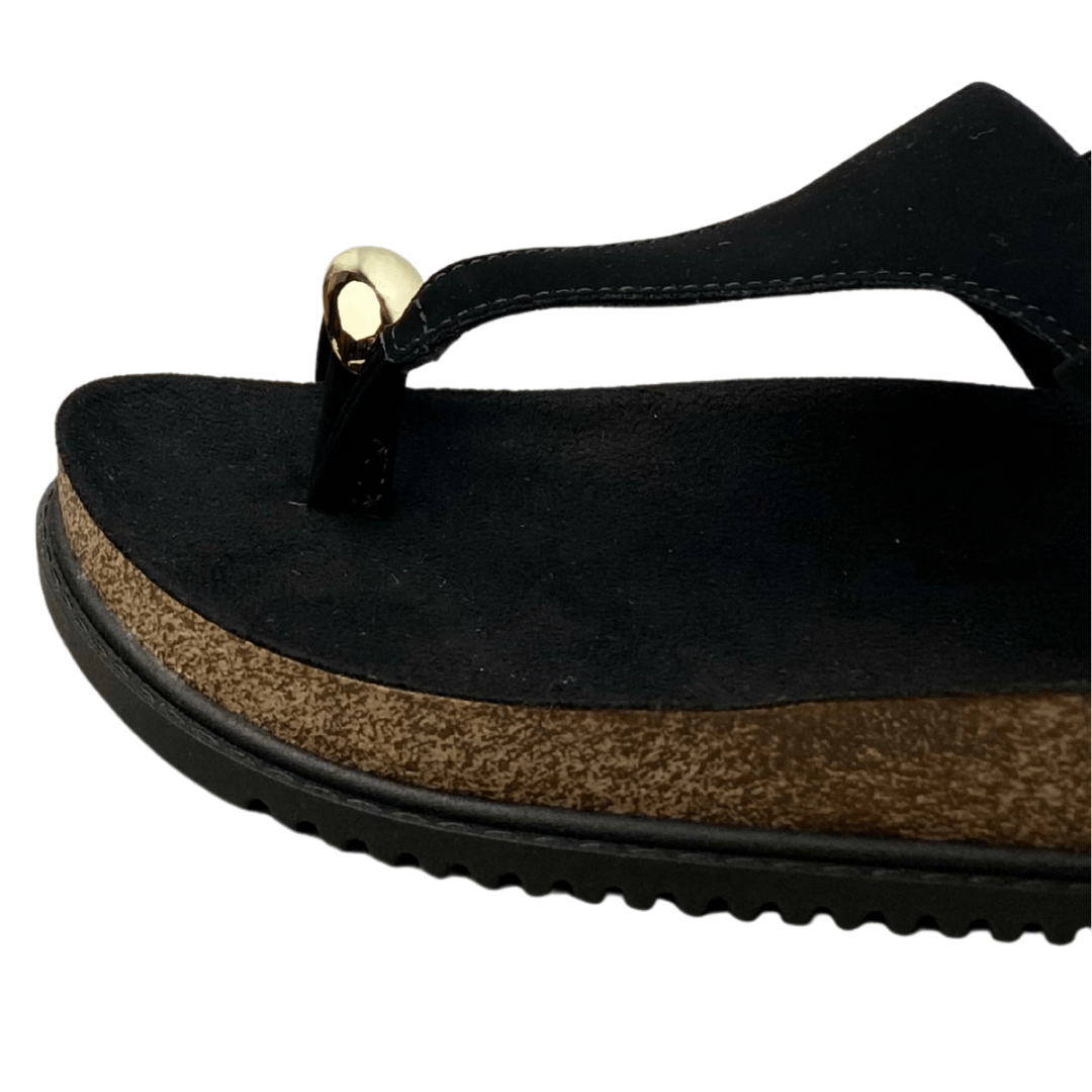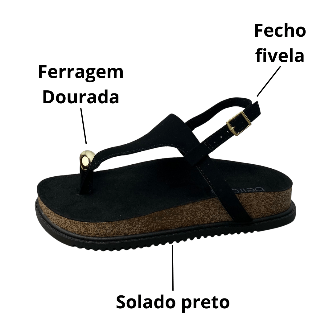 Ideal para compor desde looks casuais com jeans e shorts até combinações mais arrumadas com vestidos e saias. O contraste entre o preto e o dourado acrescenta um toque elegante e sofisticado, permitindo que a sandália seja usada em diversas ocasiões.